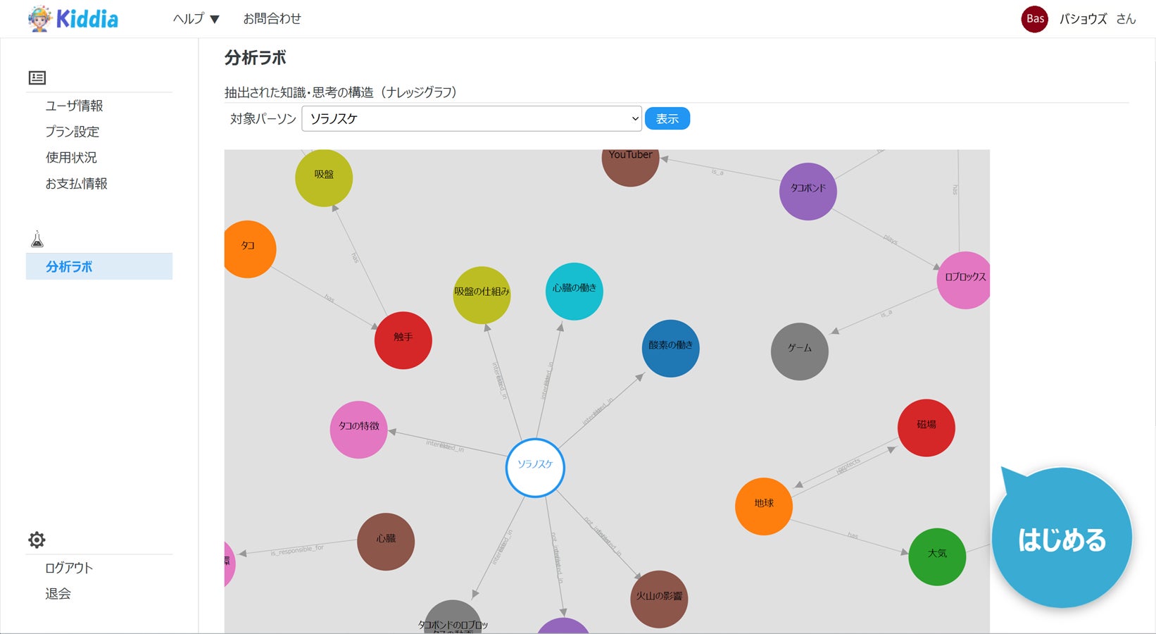 Kiddiaデジタルヒューマンと対話を続けることで、AIによる分析データが蓄積され、 お子様の知識・思考の構造をナレッジグラフとして参照することが出来ます。