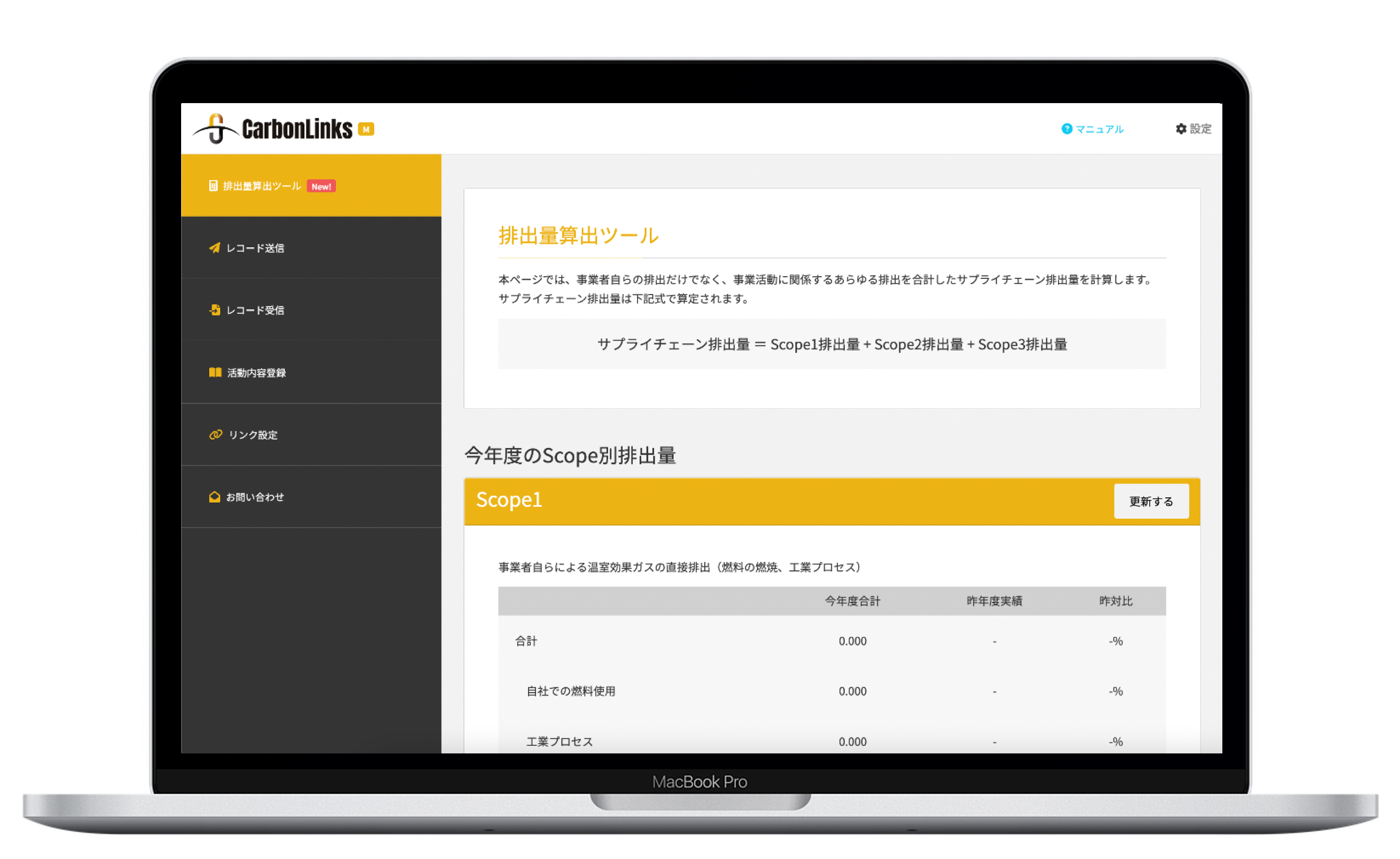 「CarbonLinks」はSaaS型のクラウドソリューションで、ブラウザ上の簡単な操作で「CO2排出量の算出(可視化)」「取引先への排出量の通知」「GHGプロトコルに基づくサプライチェーン排出量算出機能(Scope1,2,3)」に関わる業務を効率的に運用することができます。