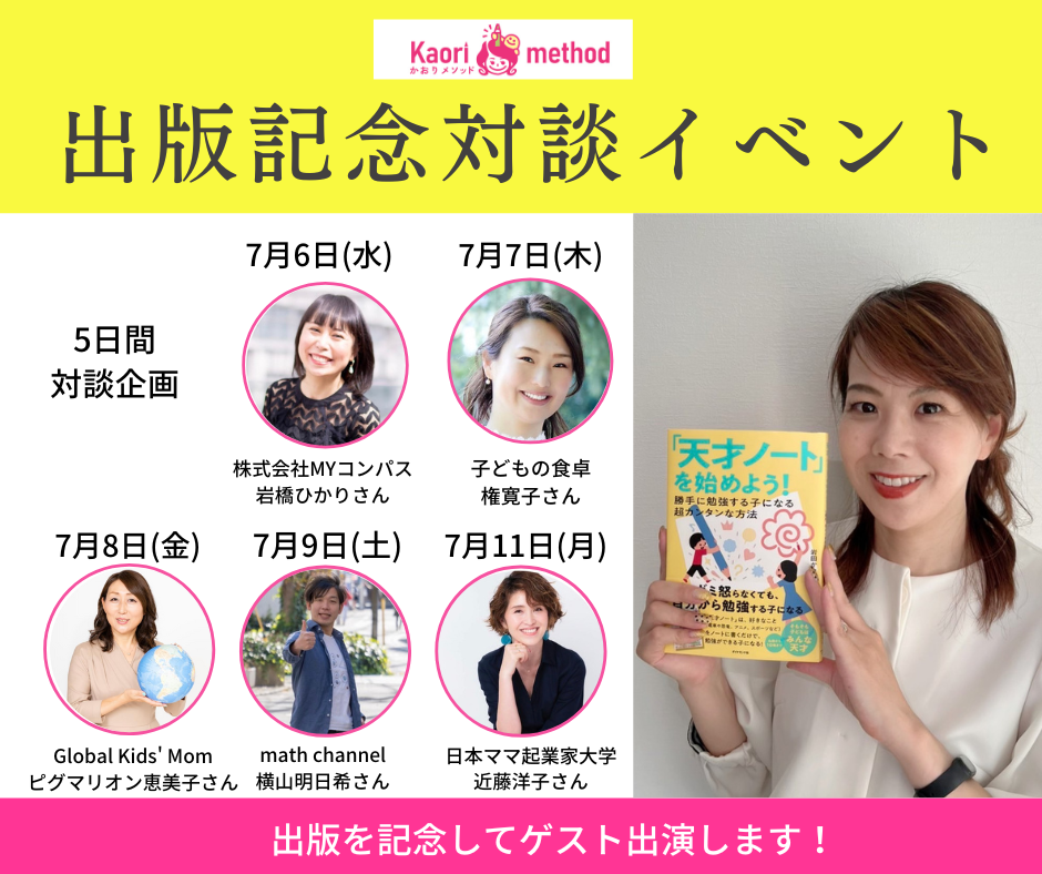 ガミガミ言わなくても勉強する子に育てる!「かおりメソッド」や「天才ノート」など、家庭教育事業を運営する株式会社ママプロジェクトJapan(所在地:東京都港区、代表:岩田かおり、以下「当社」)代表の岩田かおりが、ダイヤモンド社より『「天才ノート」を始めよう! 勝手に勉強する子になる超カンタンな方法』を本日7月6日より発売いたしました。本書は、4~10歳の子どもを育てる親向けの指南書として実例を多く含み、再現しやすい手順を紹介しています。