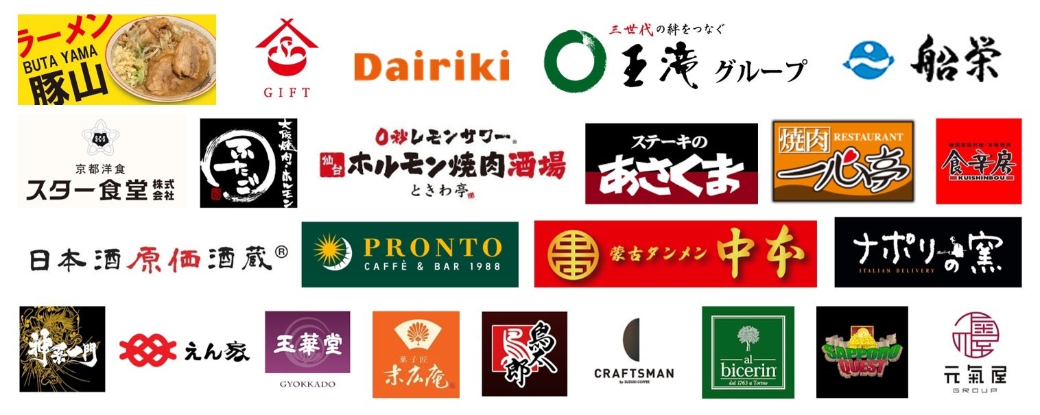 「スター食堂」様、「大阪焼肉ホルモンふたご」様、「0秒レモンサワー仙台ホルモン焼肉酒場 ときわ亭」様、「ステーキのあさくま」様、「焼肉レストラン 一心亭」様、「日本酒原価酒蔵」様、「PRONTO」様、「蒙古タンメン中本」様、「ナポリの窯」様、「豚山」様、「神系一門」様、「食辛房」様、「えん家グループ」様、「玉華堂」様、「末広庵」様、「鳥太郎」様、「クラフトマン(鈴木コーヒー)」様、「ビチェリン」様、「さっぽろクエスト」様、「元氣屋グループ」様、「esエンターテイメント」様 etc.