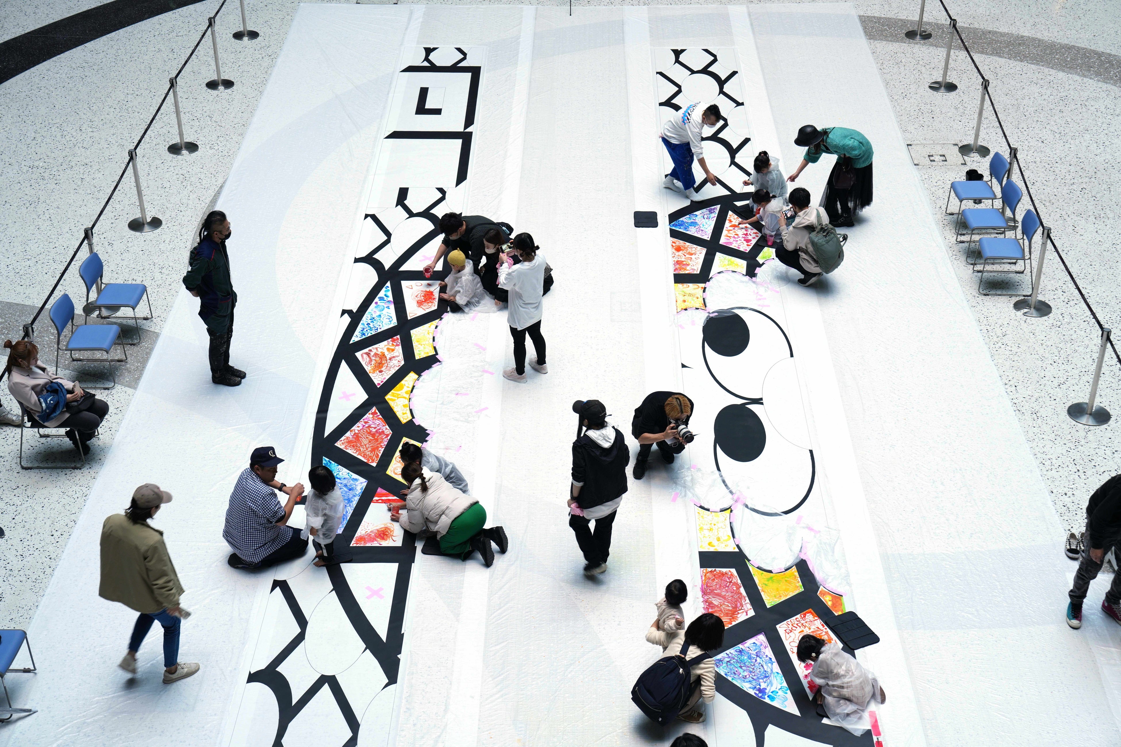 北館1階ナレッジプラザでアーティスト:MASAGONが4日間かけて公開制作。制作期間のうち3月18日(土)に実施したワークショップに参加した38名の子どもたちもアーティストと共に力いっぱいペイントを施し、エネルギー溢れる作品が完成しました。アーティストと子どもたちが共創した彩り豊かなグラフィックが、「10」の文字と共に大階段一面に浮かび上がります。