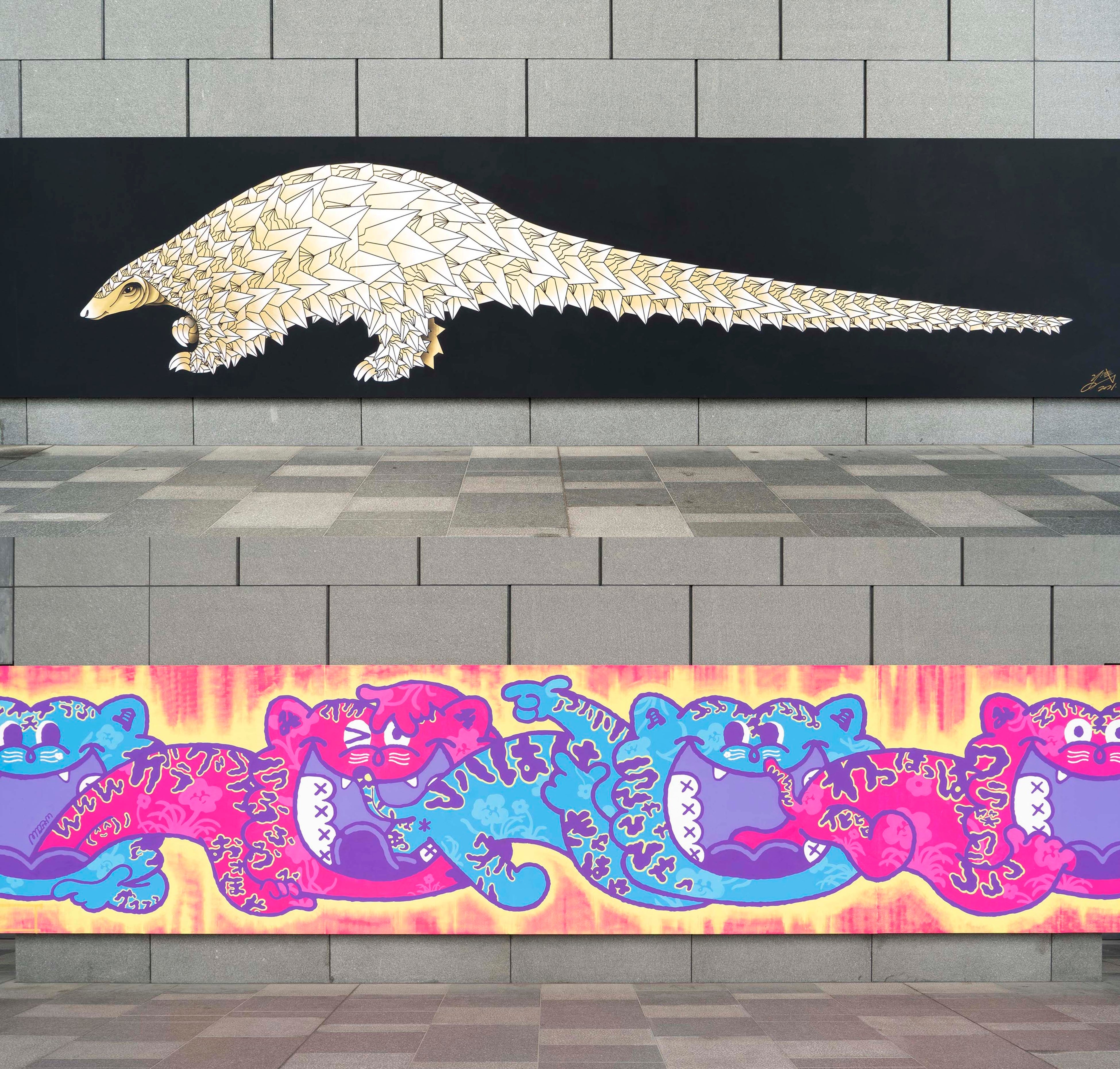 作品説明:コロナの猛威によって、あらためて私たちの経済圏は大自然の 中にあった事を強く思い知らされました。局地的に深刻な被害をもたらす地 震や津波、台風や火事よりも広範囲に、ウィルスは影響を与えます。飛行 機などの交通網が世界を覆う快適さに伴って、ウィルスはあらゆる都市に蔓 延できる可能性を手に入れたのでしょう。 自然の生態系を記号化したこのウォールアートは、動植物が自然環境と重 なり合って、一体となって、強かに生き抜く姿を示しています。微生物やウィ ルスを内包しながら、あらゆる生き物たちが関係し合った全体から、私たちが 学ぶことはとても沢山あります。 都市部にあっても、本当は自然の中にある私たちの生活が、こうした時代に 合わせて変化し、修正し、より良い世界に繋がっていきますように。