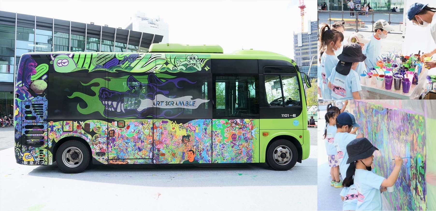 作品説明:うめきた広場で、総勢23名のアーティストが梅田エリア巡回バス「うめぐるバス」の車体にライブペイントを実施。また、ワークショップに参加した50名の子どもたちもアーティストと共に力いっぱい「うめぐるバス」にペイントを施し、エネルギー溢れる『うめぐるARTバス』が完成しました。23名のアーティストと50名の子どもたちが共創した『うめぐるARTバス』が梅田のまち中を駆け抜けました。