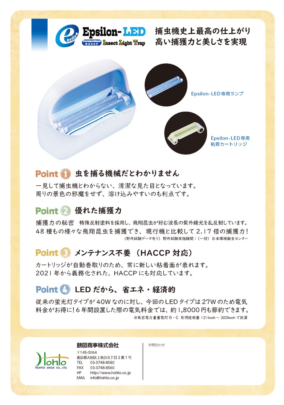 害虫・害獣・害鳥駆除の殺虫剤・殺鼠剤をはじめとする資機材を日本全国の害虫駆除業者、シロアリ駆除業者に卸売販売する鵬図商事株式会社(本社:東京都大田区 代表取締役:添野正宏 https://www.hohto.co.jp/)は、殺虫剤を一切使わずハエ類を捕獲できるHACCP対応LED捕虫機「Epsilon-LED」を2022年8月1日から発売します。