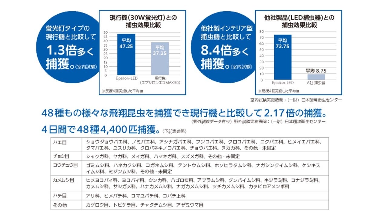 蛍光灯タイプの現行機と比べて1.3倍。野外試験では4日間で48種4,400匹の飛翔昆虫類を捕獲しました。