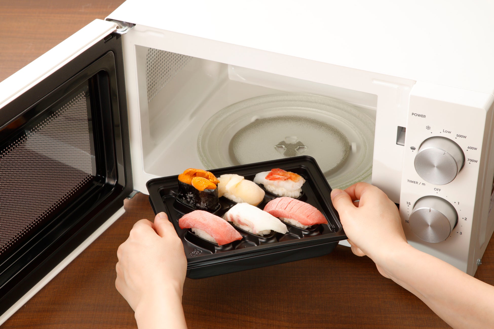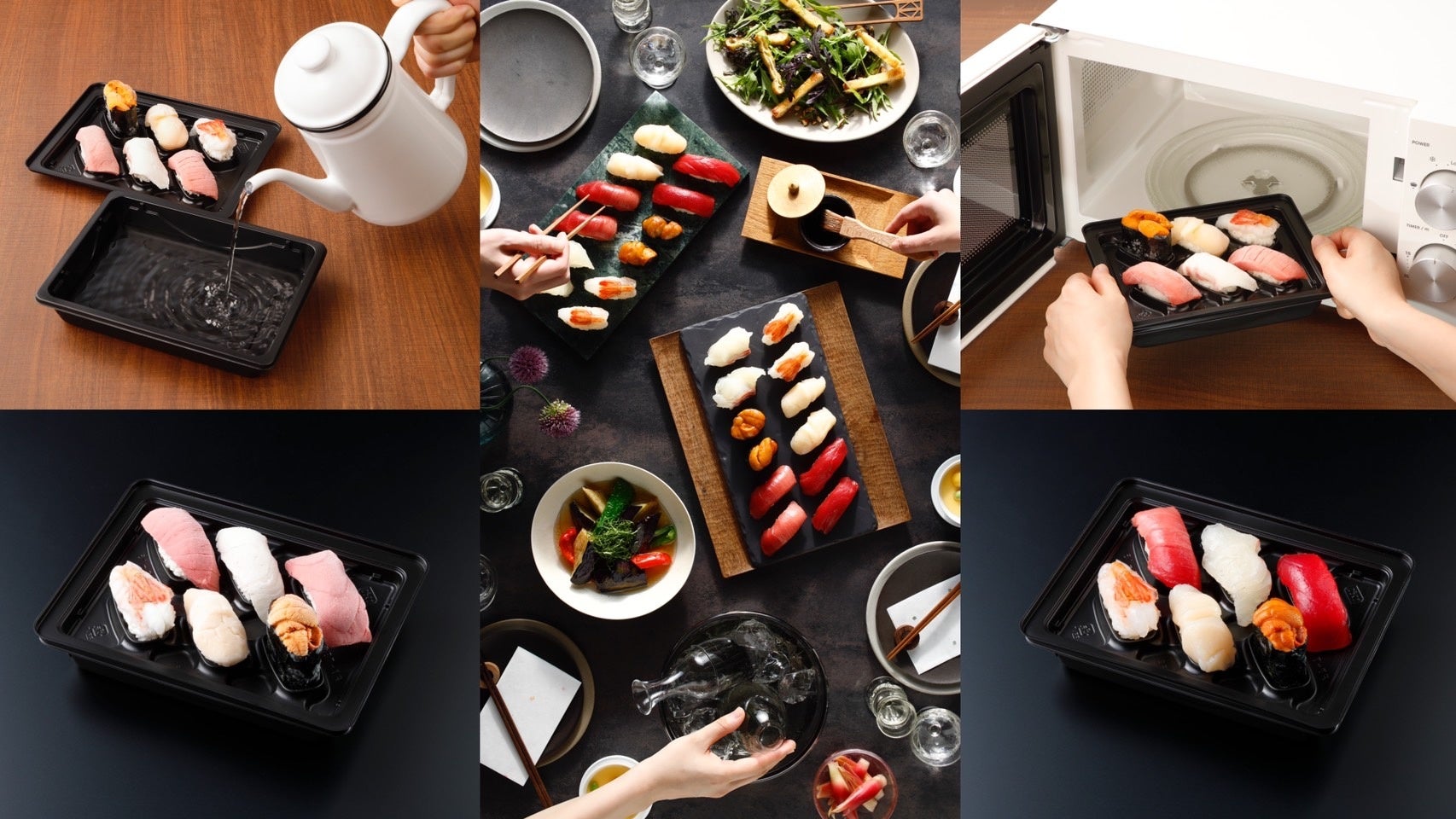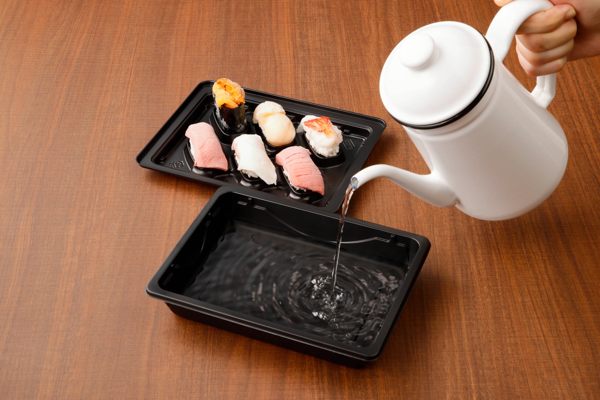 本格的な握りをご家庭で手軽に食べられるよう、専用容器を独自に開発。二段重ねの容器の上段には、職人が握った寿司を並べており、容器の下段には、解凍の際に水をいれるスペースを作り、マイクロ波を下段の水に集中させ、ネタやシャリが温まりすぎるのを防ぐ仕組みとなっています。これにより、ネタは新鮮なまま適度に冷たく、シャリはほんのりあたたかい人肌の温度を実現しました。