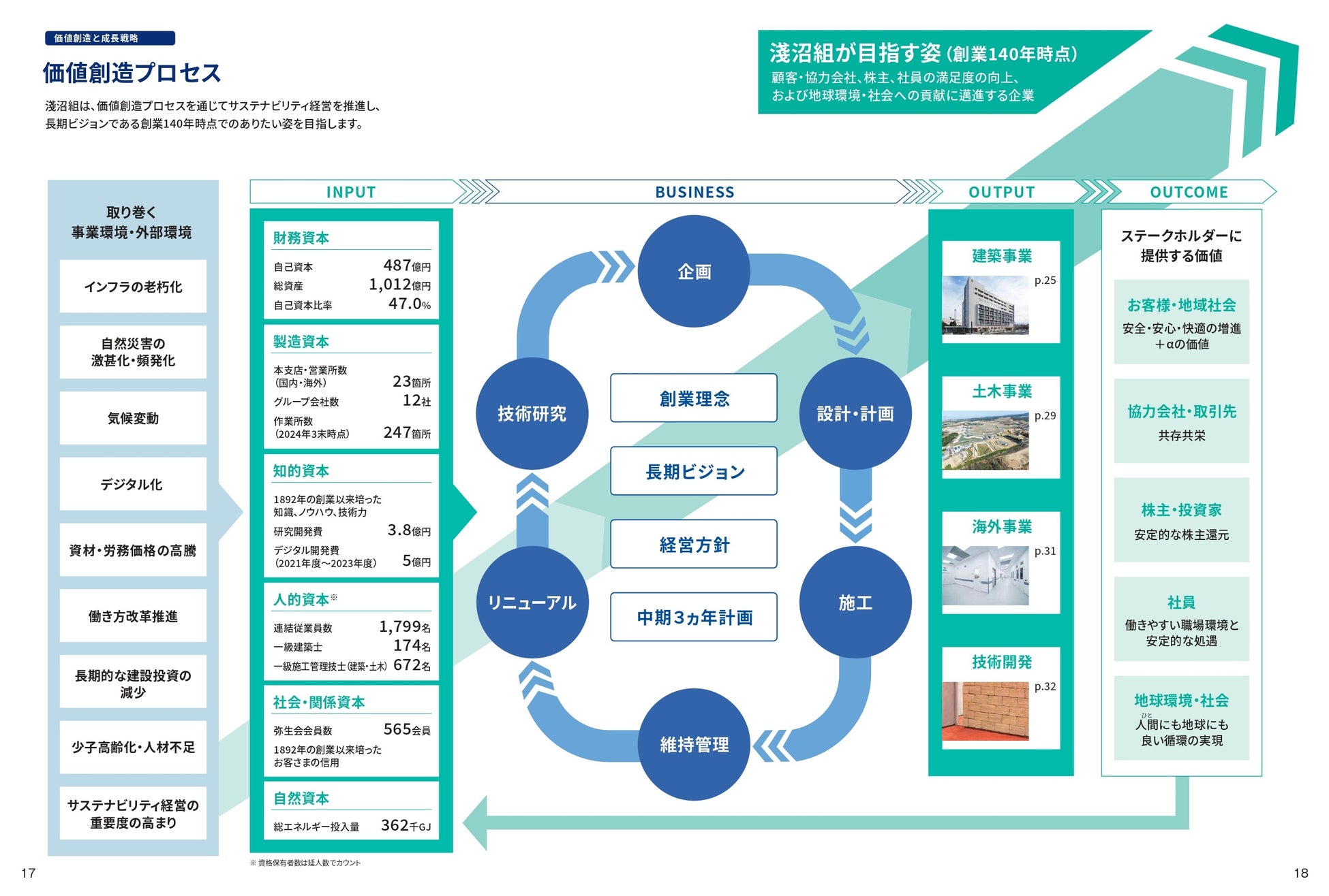 トップメッセージ/中期3ヵ年計画(2024~2026年度)/淺沼組の歴史/価値創造プロセス/マテリアリティ/特集:社外取締役座談会/事業の概況 |