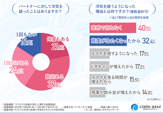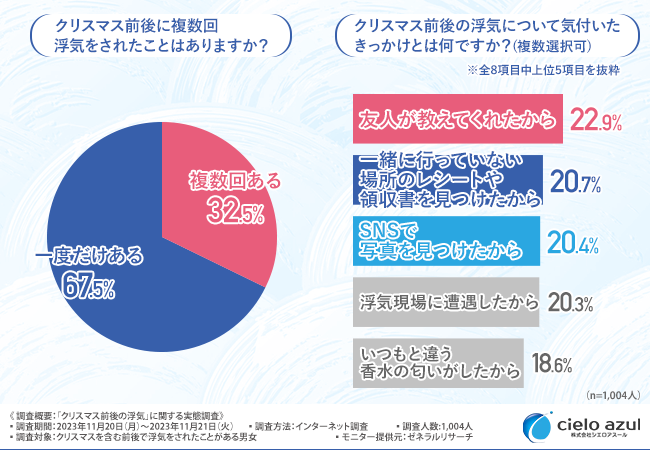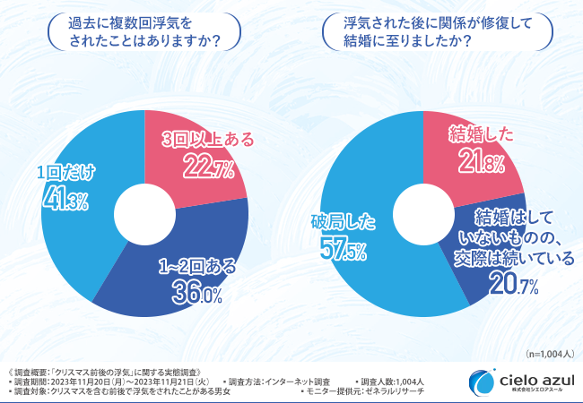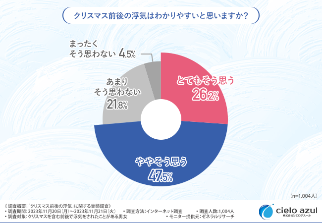 株式会社cielo azul(所在地:福岡県福岡市、代表取締役:大泉 聡)は、クリスマス前後で浮気をされたことがある男女を対象に、「クリスマス前後の浮気」に関する実態調査を実施しました。