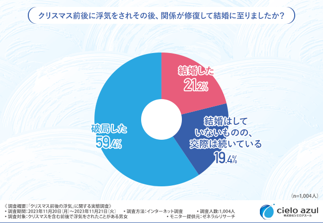 さらに、「クリスマス前後に浮気をされその後、関係が修復して結婚に至りましたか?」と質問したところ、『結婚した(21.2%)』『結婚はしていないものの、交際は続いている(19.4%)』『破局した(59.4%)』という回答結果になりました。