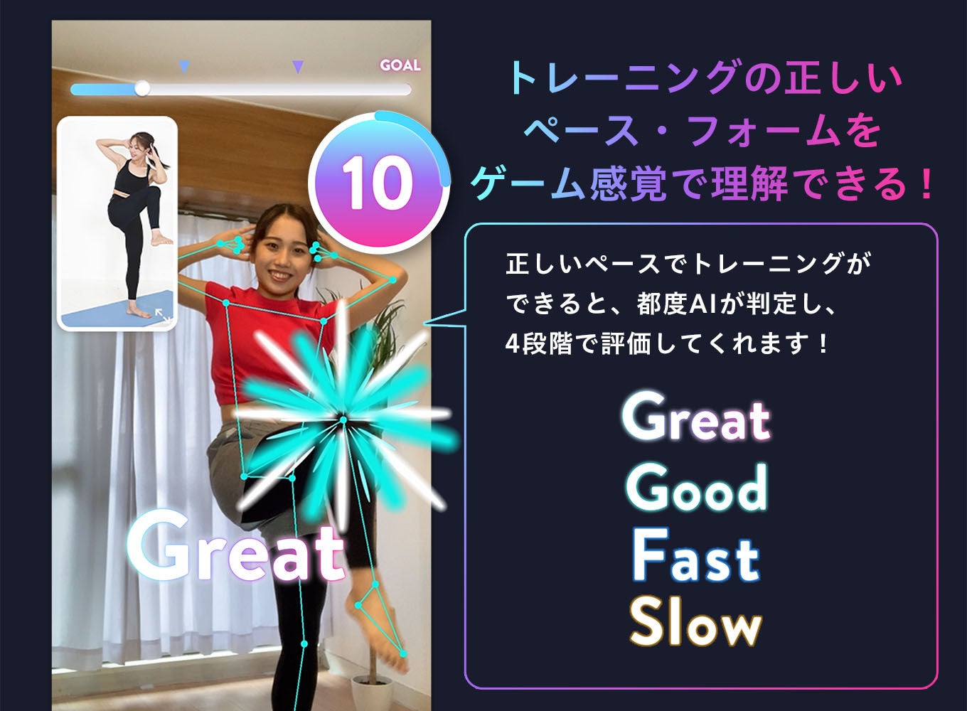 お手本と同じタイミングで動けたらリアルタイムでGreatやGoodなどのエフェクトを表示して応援します。