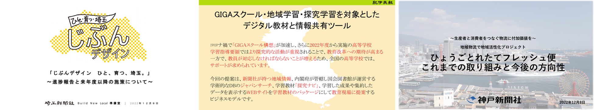 昨年度実施した第1回「Build New Local プロジェクト」の結果、最優秀賞を埼玉新聞社、続いて紀伊民報(優秀賞)、神戸新聞社(特別賞)が受賞し、GNIと中長期的なパートナーシップを結んで実装化を進めています。