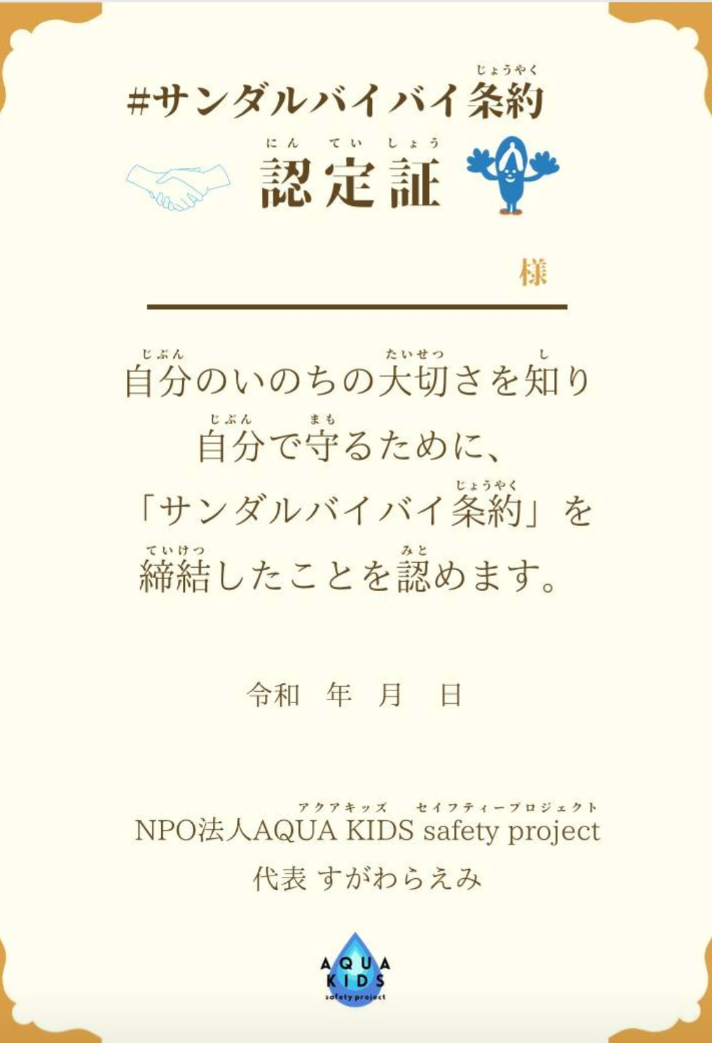 流されたサンダルを追いかけて溺れる水難事故を予防するキーワード「サンダルバイバイ」発信元のNPO法人AQUAkids safety projectが7月30日を「サンダルバイバイの日」に制定しました。
