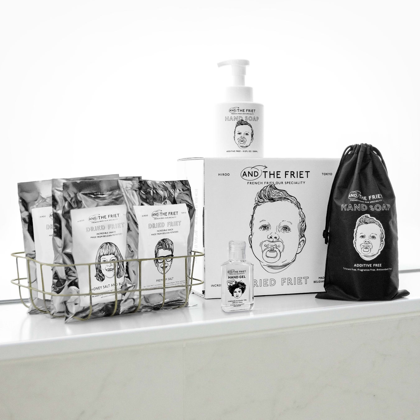 HAND SOAPとレギュラーサイズのドライフリット個包装をベビーカートンボックスに入れてお届けします。ハンドソープが巾着に入っているので、ギフトにもおすすめです。
