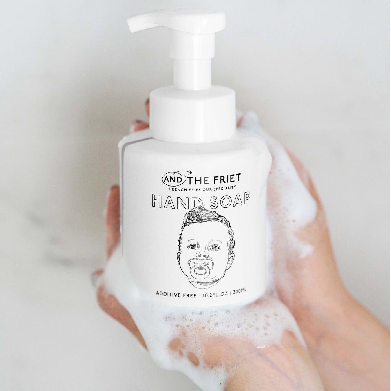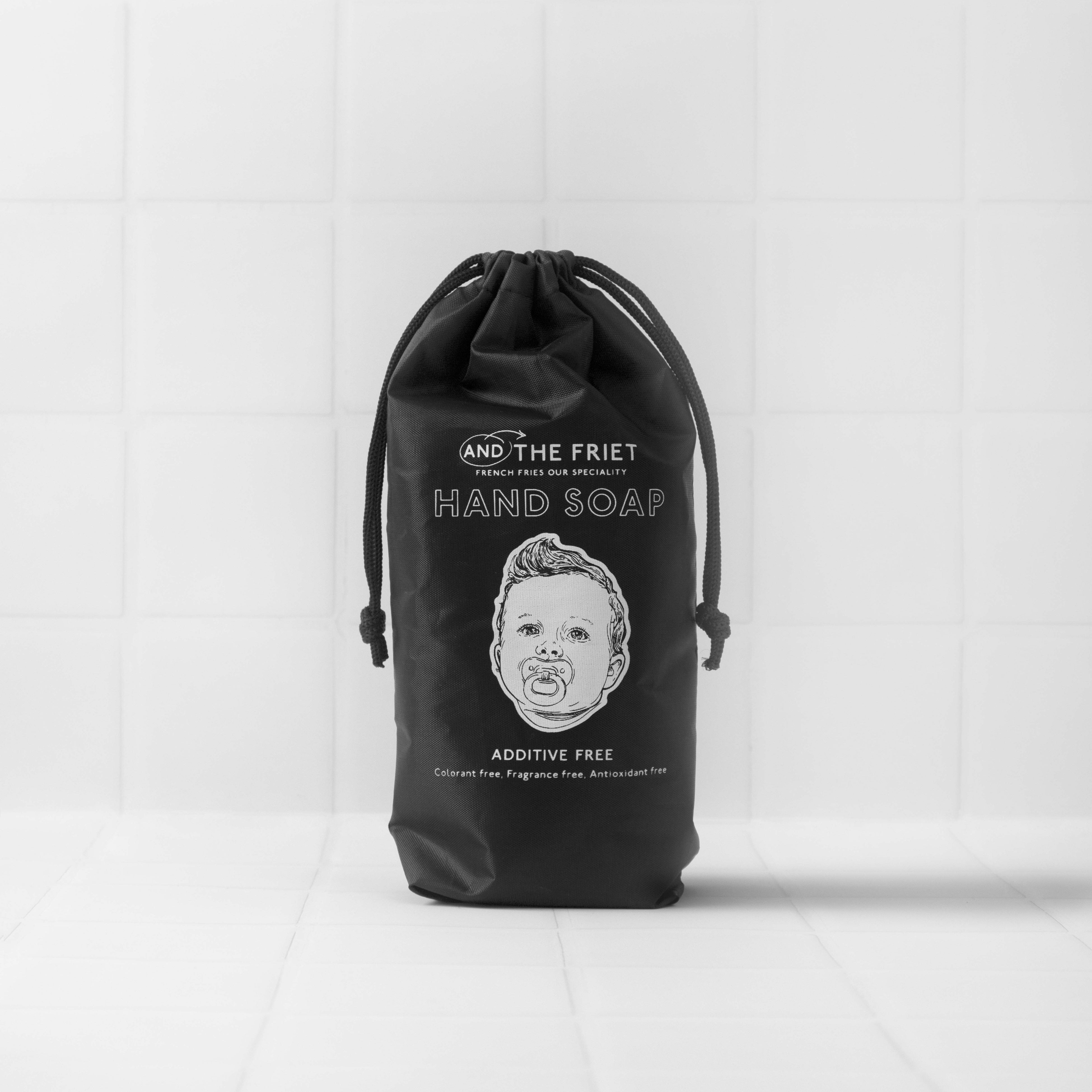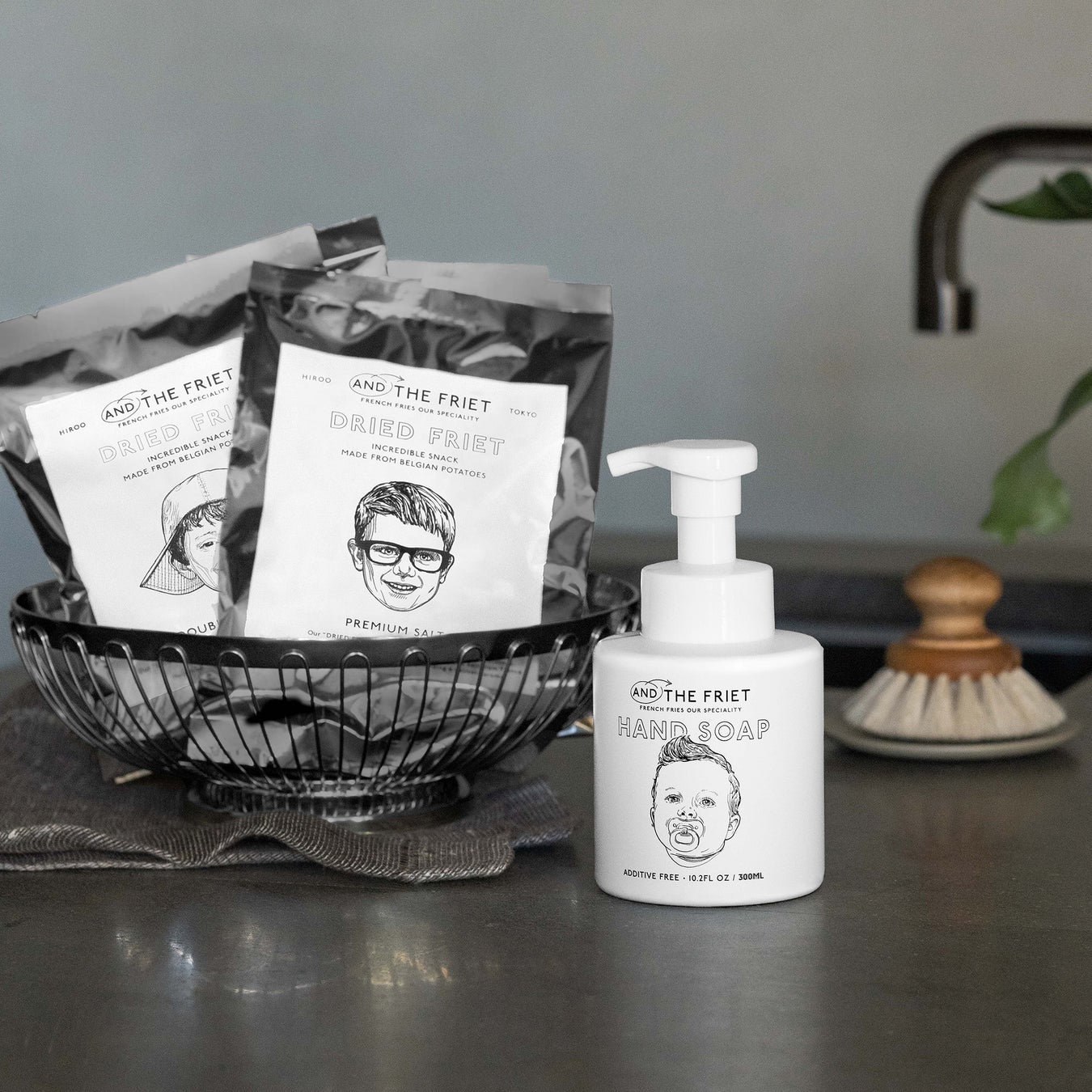 ドライフリットをおいしく召し上がる前に使うのにぴったりな無香料のハンドソープ。ボトルには、 シャボンちゃんをイメージしたベビーイラストが描きおろされています。オリジナル巾着付き。