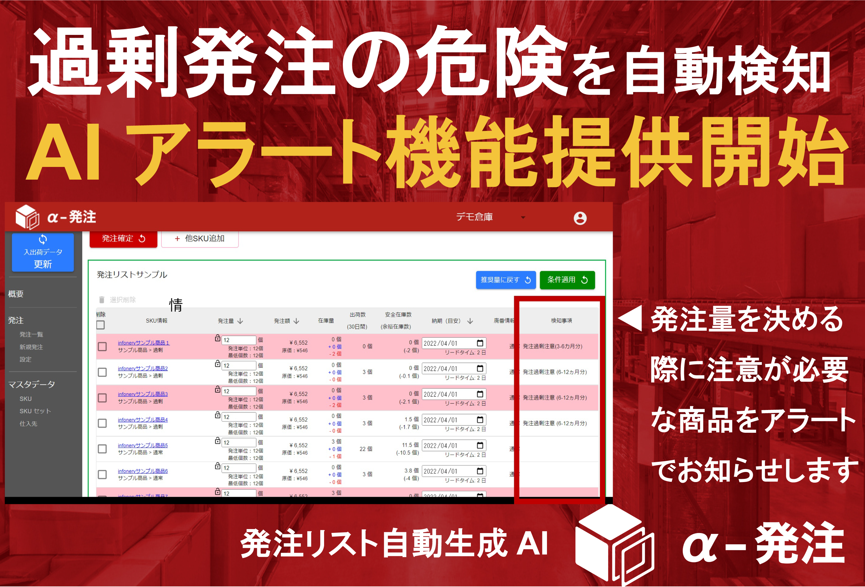 EC小売りおよび卸売り事業者向けに、適切な発注リストを自動で生成するAI「α(アルファ)-発注」を提供する株式会社infonerv(東京都杉並区、代表取締役:江田研人 以下、当社)は、過剰発注になってしまう危険性の高い商品を自動で検知して、ユーザーに注意喚起する機能の提供を開始しました。これにより「α-発注」の利用ユーザーは、発注前に過剰発注の危険を知ることができ、在庫量を適切に保つことが可能になります。