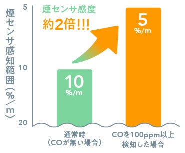 ※4:【一酸化炭素を検知していない場合】感度種別2種(煙作動点5〜15%/m)【⼀酸化炭素100ppm以上を検知した場合】感度種別1種(煙作動点2.5〜7.5%/m)