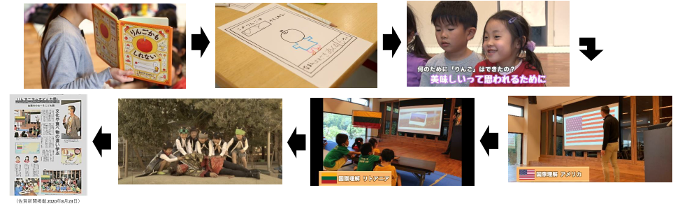 例えば、 2021年度テーマ「幸せってなんだろう?」では、絵本から「しあわせ」というキーワードに興味を持ち、その後、日本の幸福度の低さについて課題を発見し、幸福度の高い国や地域である「デンマーク」「ブータン」「ブラジル」「沖縄」について、実際に佐賀在住のネイティブの方や、現地に詳しい方をお招きし、様々な「幸せのカタチ」について学びを深めました。さらに、「デンマーク」に「森のようちえん」という1日中、森の中で過ごす幼稚園の存在があることを知り、実際に地域の森をフィールドにして体験しました。五感(見る・聴く・触る・嗅ぐ・味わう)をめいいっぱい使って、自然を感じた子どもたちは「幸せだね」と自然に口にする様子を見て、幸福度の高さに繋がっているかもしれないと、子どもたち、職員みんなで考察し合いました。国際理解教育からSDGsの目標である「GOOD HEALTH AND WELL-BEING(すべての人に健康と福祉を)」に繋げ、実際のアクションへと進んでいきました。