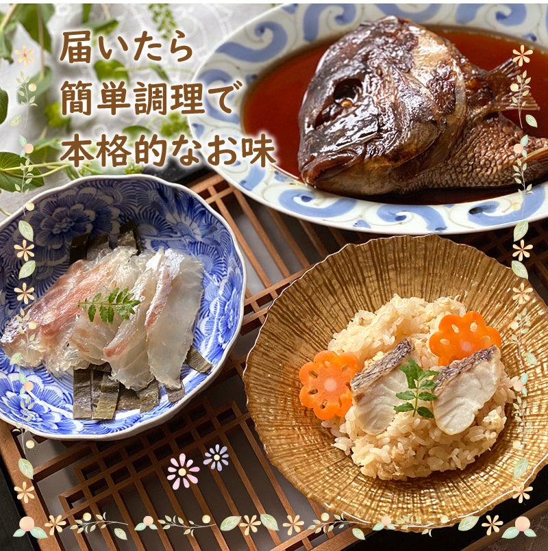 鯛しゃぶセット以外にも、名物の鯛のかぶと煮、鯛めし、鯛昆布〆など、鯛を中心とした加工品を販売しています。どの商品も簡単なのに本格的な味。