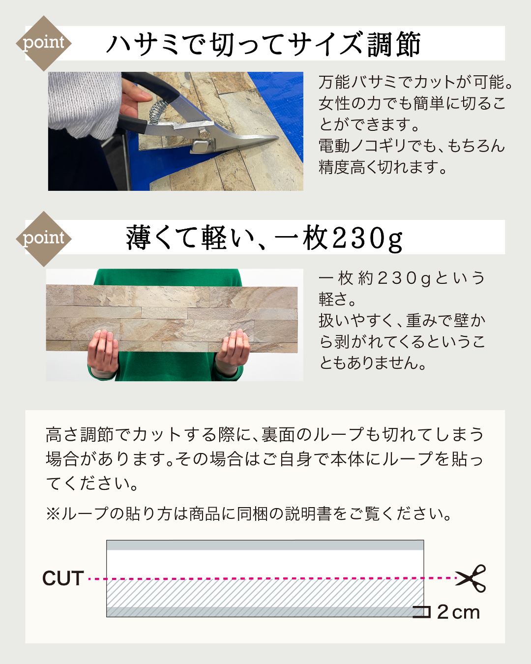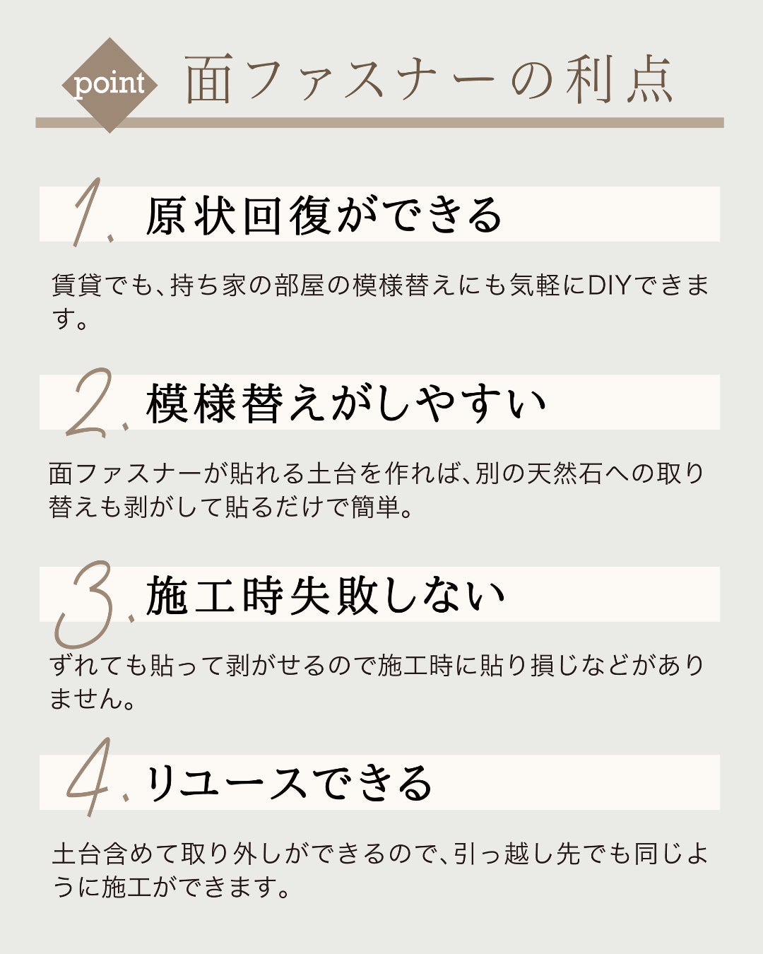 ドイツで開発された天然石を薄く剥がす技法を利用して作られた 天然石の壁紙 (スリムストーンベニアモザイク = SSVM)に面ファスナーを応用した新商品が登場しました。