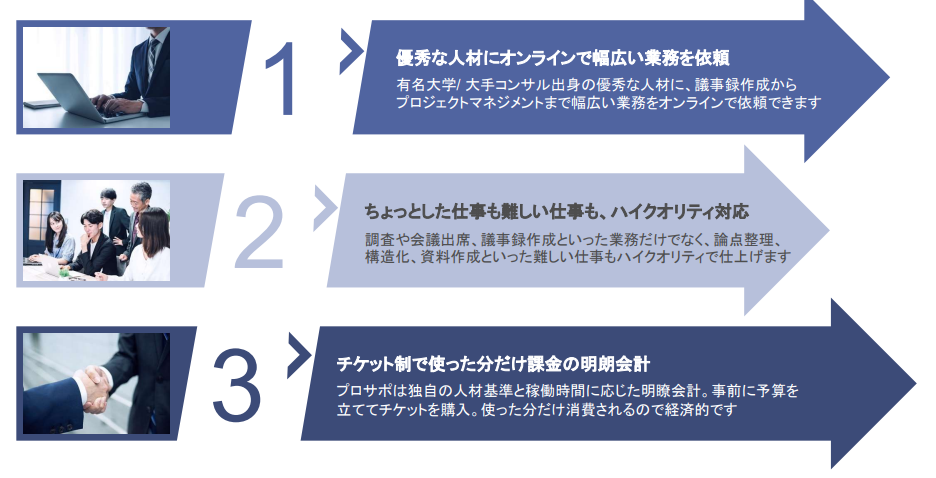 「プロサポ」は、フルタイム採用が難しい優秀な若手人材が、秘書のように1対1で対応し、エグゼクティブクラ