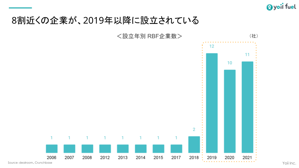 設立年を見ると、8割以上の企業が2019年以降に設立されています。RBF自体、新しいビジネスモデルであるため、設立3年以内のスタートアップが大半を占めているのが実態です。