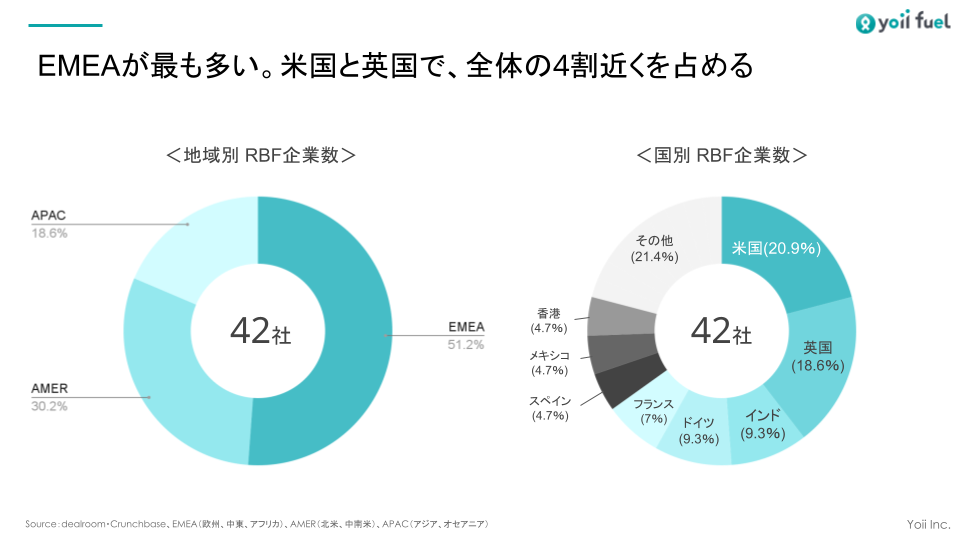地域別で見るとEMEA(欧州・中東・アフリカ)最も多く(22社)、全体の半数以上を占める形となりました。イギリスを筆頭に欧州では多くのFintechスタートアップが誕生しています。RBFにも同様のトレンドがあると推察します。