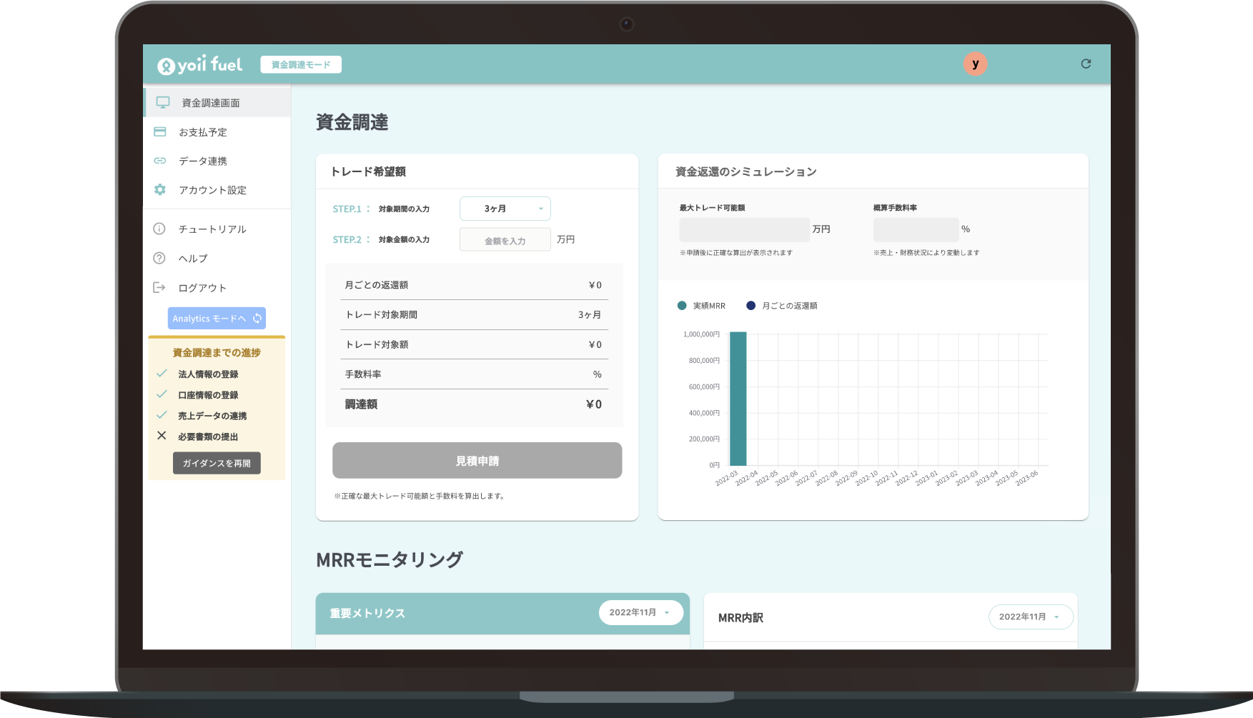 Stripeやfreeeをはじめとする財務データと連携するだけで、売上実績から将来発生する売上を予測。将来の売上を買い取る形で、いま必要な資金を提供しています。主に広告宣伝費やブリッジファイナンスを目的とした資金調達に活用されています。