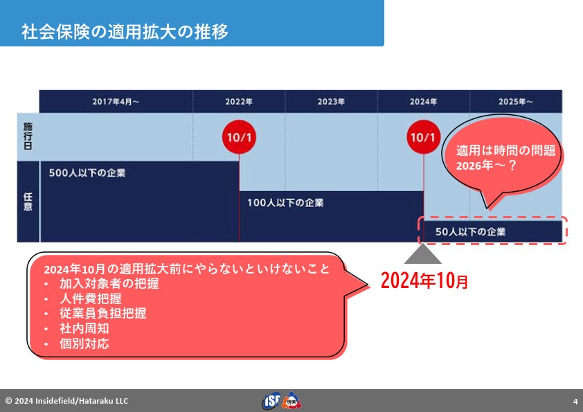 合同会社傍楽グループの社会保険労務士事務所インサイドフィールド(滋賀県東近江市、代表:内野学)は、2024年10月に社会保険の適用拡大が施行されることをうけ、適用拡大の概要と対応手順、使える助成金、中小企業に与える影響をまとめた資料「社会保険適用拡大の対応と中小企業に与える影響」を今月リリースしました。