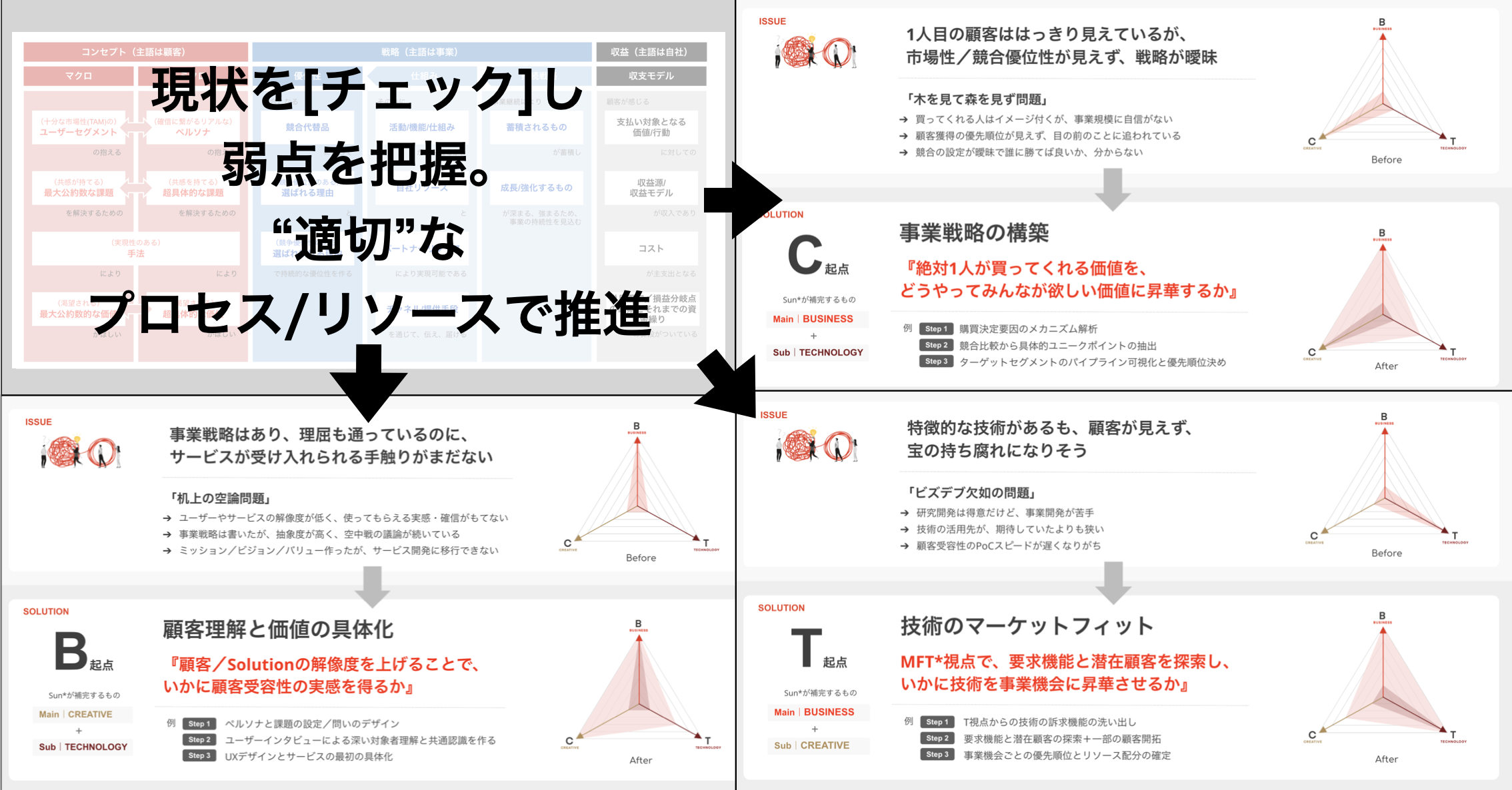新規事業担当者は、この構文を書くだけで、事業全体の整合性の確認、つまり偏りがちな視点に気づき、プロジェクトにとって必要なプロセスとリソースが把握できるようになります。
