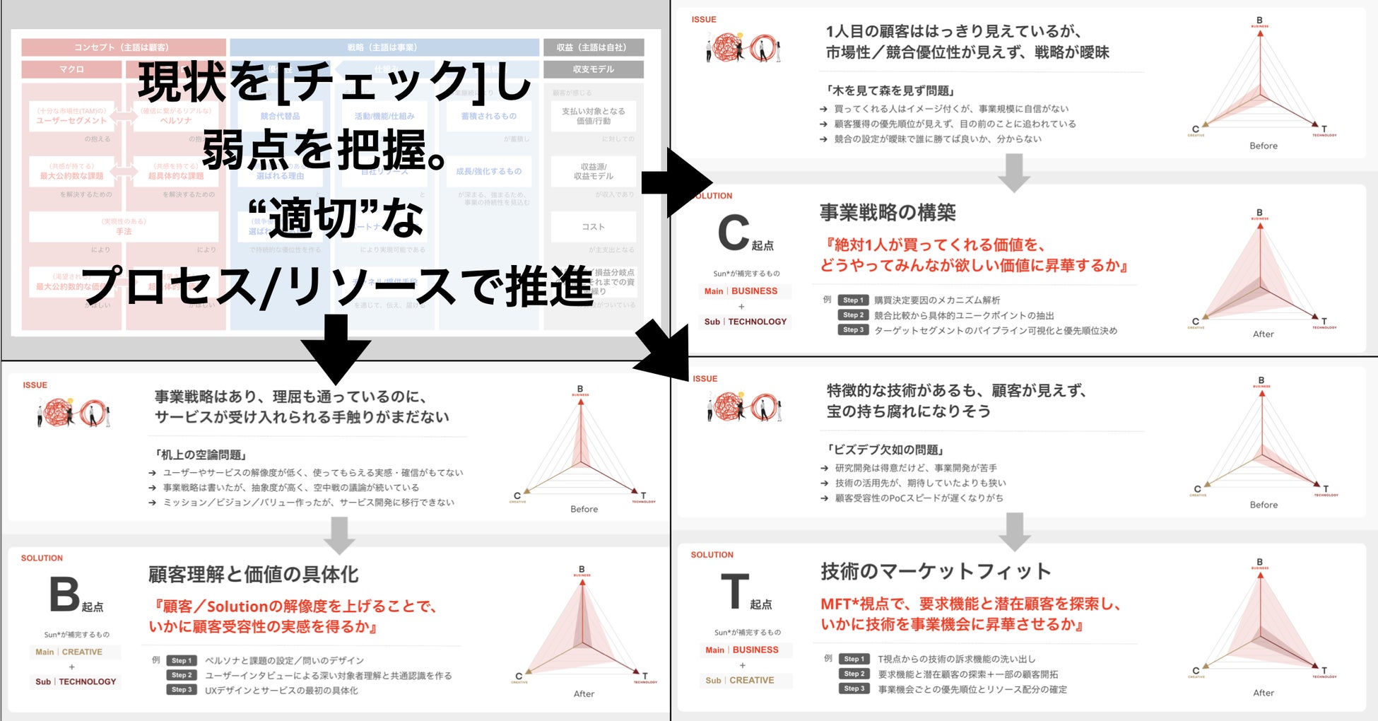 新規事業開発プロジェクトは、ビジネス(B)・テクノロジー(T)・クリエイティブ(C)を融合し、不確実性を下げながら創り続けることが重要になりますが、企業が保有するリソース、新規事業担当者やプロジェクトチームの経験・スキルに依存して進められることが多く、意図せずにBTCいずれかの視点に偏って検討されているのが現状です。