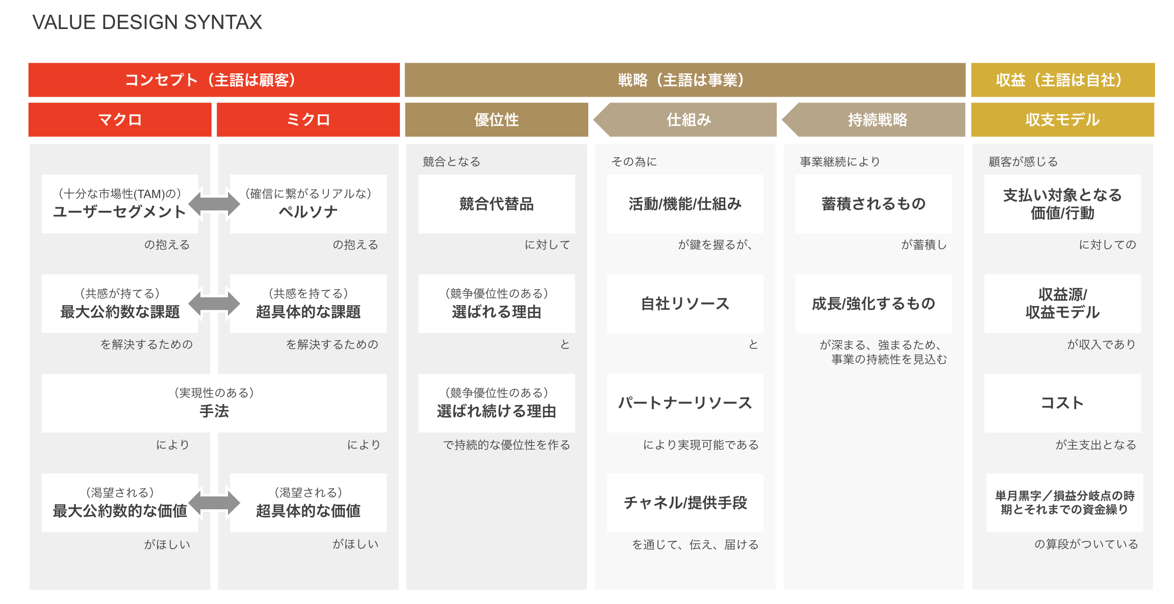 「バリューデザイン・シンタックス」は、ビジネスモデルを構成する要素を分解し、ひとつの構文として表現しています。フレームワークに沿って事業構想を文章化することで、全体像が可視化され構成要素の整合性や弱点を簡単に把握できます。