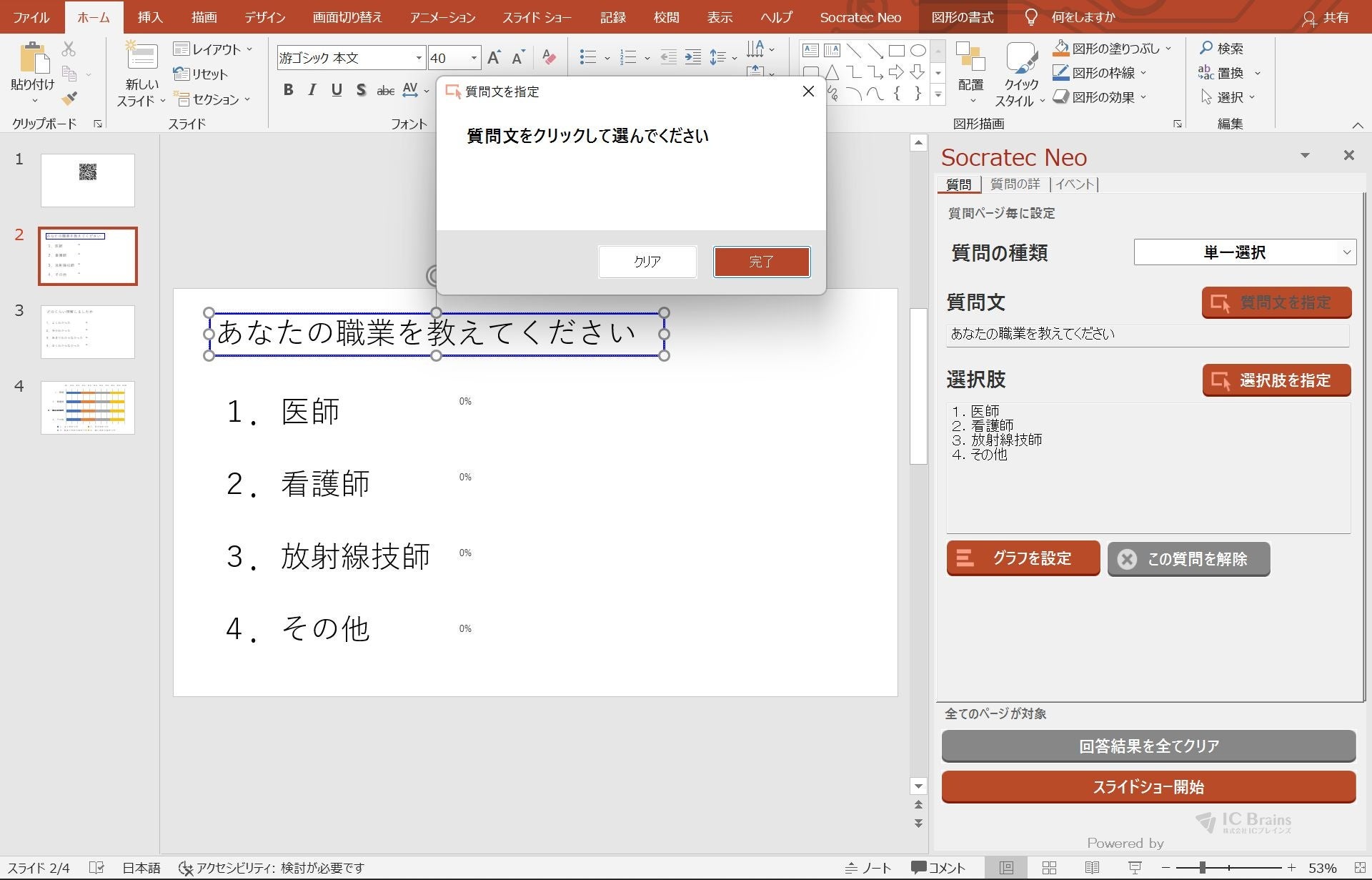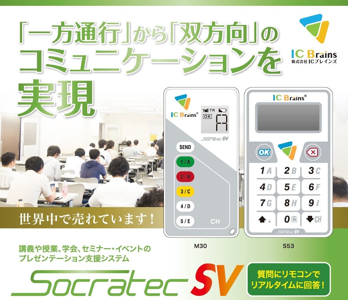 ICブレインズはそのような新しい講演会の形に対応するため、実際の会場にいる人はレスポンスアナライザー(クリッカー)を使用して投票を行い、動画配信を視聴している人にはスマートフォンやパソコンで投票を行い、それをリアルタイムで集計表示するシステム(Socratec Neo)を開発いたしました。このシステムにより今までの大勢が集まっていた講演会と同じような双方向の講演会の実現が可能となりました。