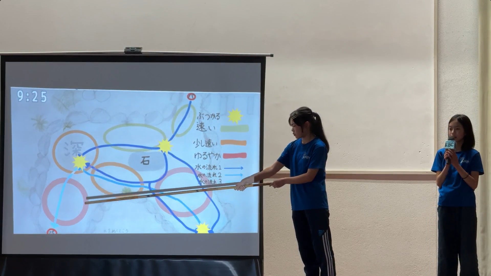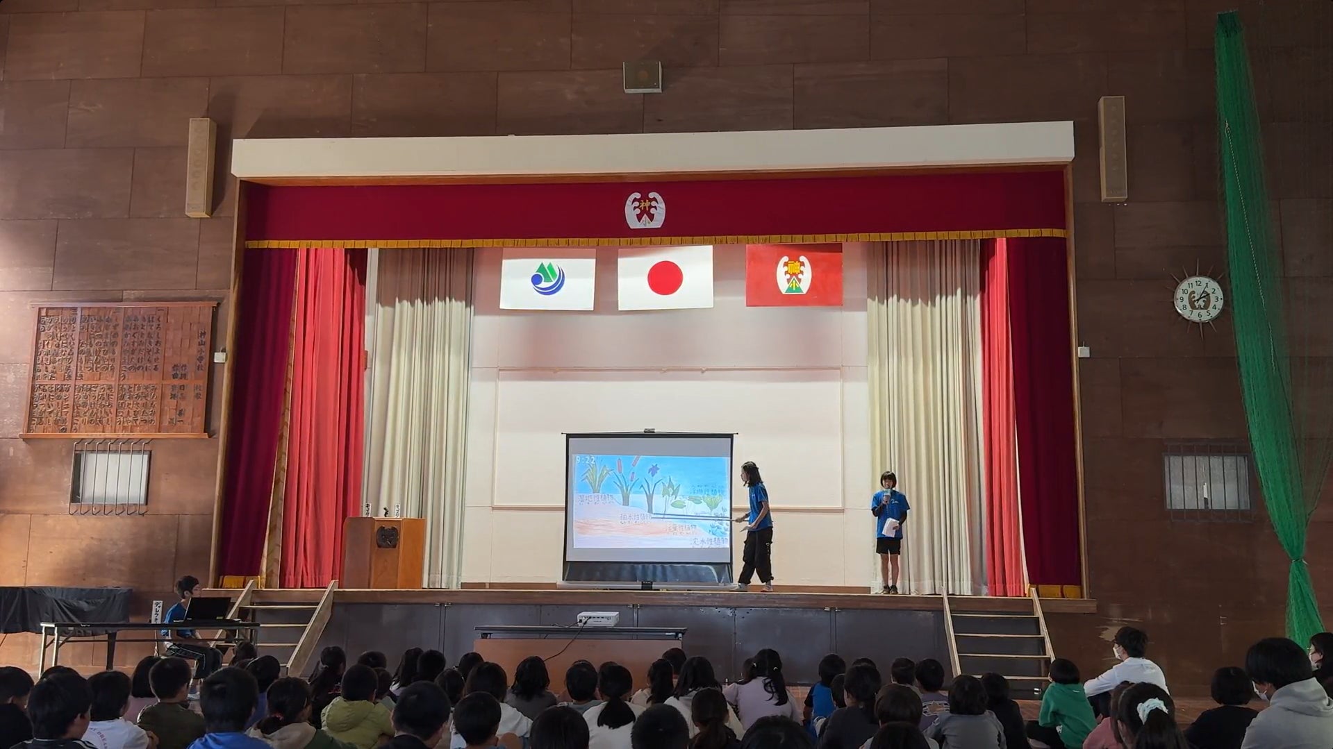 2025年2月28日に神山小学校で行われた学習発表会にはサンカラスタッフも参加し、子どもたちの取り組みを見守りました。畑を担当する5年生は、鹿児島のシェフに手紙で料理方法を相談。それをきっかけに、学校で訪問料理教室が実施され、収穫した里芋「かわひこ」を使った食事会を開いたことを発表しました。一方、観察池を担当する6年生は、保護者とともに数日かけて池の清掃を行い、在来生物の保護活動を実施。池の中にはオオウナギが生息していたことも報告しました。