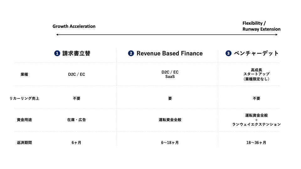 Flex Capitalにおいては、D2C/EC事業者の成長を加速させるために、D2C/EC事業者が支払う必要がある請求書を立替払いする「請求書立替」、リカーリングビジネス※1を展開する事業者の将来売上を先取りして実現する「Revenue Based Finance」、レイタースタートアップの経営の自由度(フレキシビリティ)を高める「ベンチャーデット」の3プロダクトを展開しています。