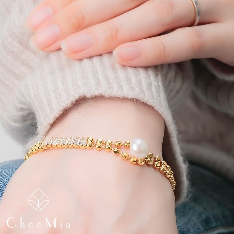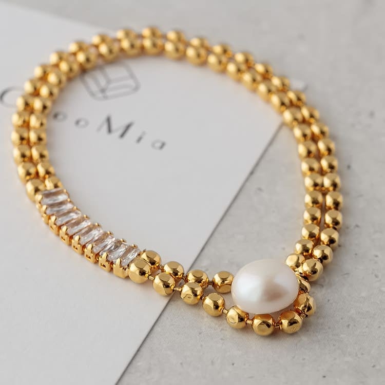 - 天然パール×ジルコン×ボールチェーンブレスレット