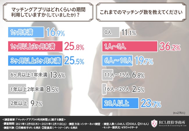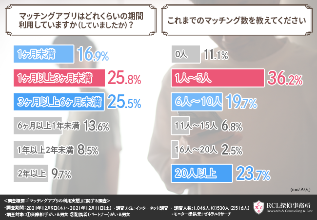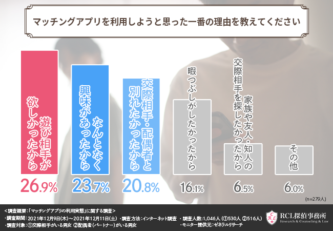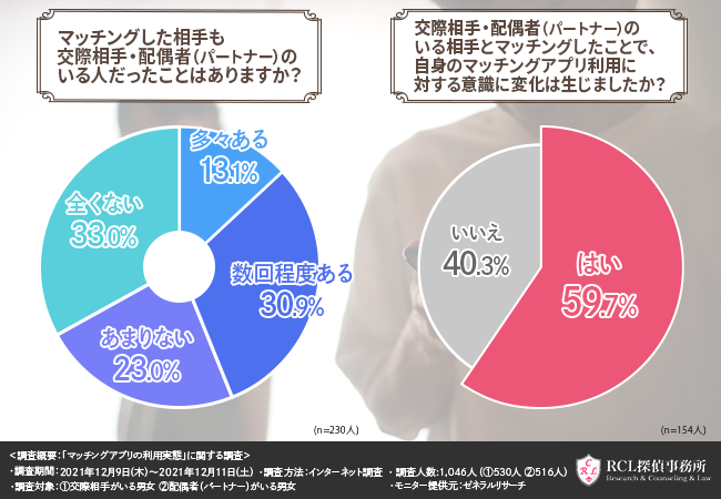 RCL探偵事務所を運営する株式会社RCLは、①交際相手がいる男女、②配偶者(パートナー)がいる男女を対象に、「マッチングアプリの利用実態」に関する調査を実施しました。