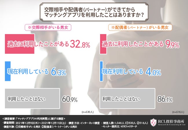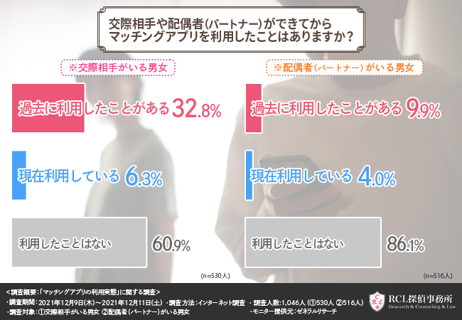 そこで今回、RCL探偵事務所を運営する株式会社RCLは、①交際相手がいる男女、②配偶者(パートナー)がいる男女を対象に、「マッチングアプリの利用実態」に関する調査を実施しました。