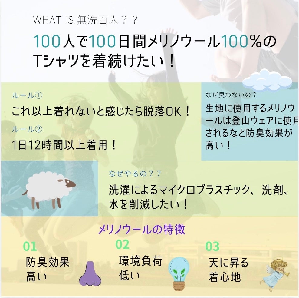 洗濯に新常識を!100日間100人がメリノウールTシャツを洗わずに着続けて、環境問題を考えるきっかけを作りたい。