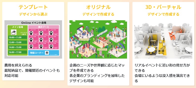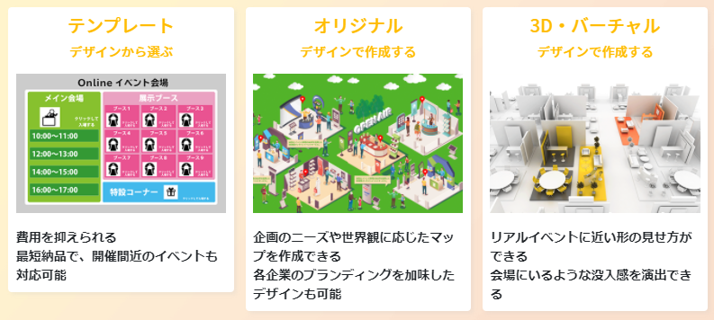 オンラインイベント会場のデザインを自由に作成可能!業種・目的別のテンプレートや低価格のパッケージもご用意しておりますので、費用を抑えての開催も可能です。