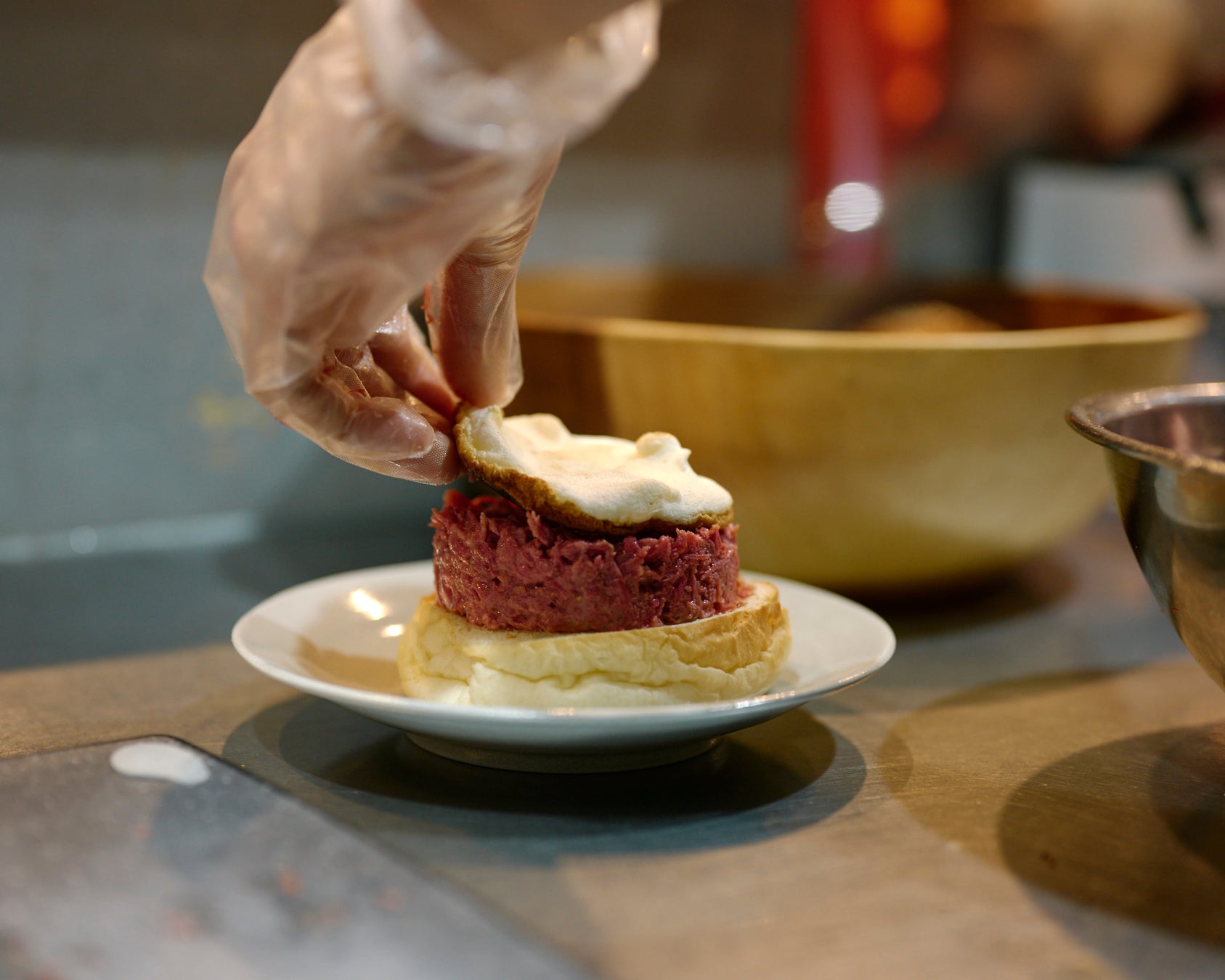 具材にはコクと色味の強い厳選した卵を使用し、ほんのり甘く仕立てた卵白の『焼きメレンゲ』と『卵黄』の絶妙な絡み合いがパティの旨みを引き立てます。