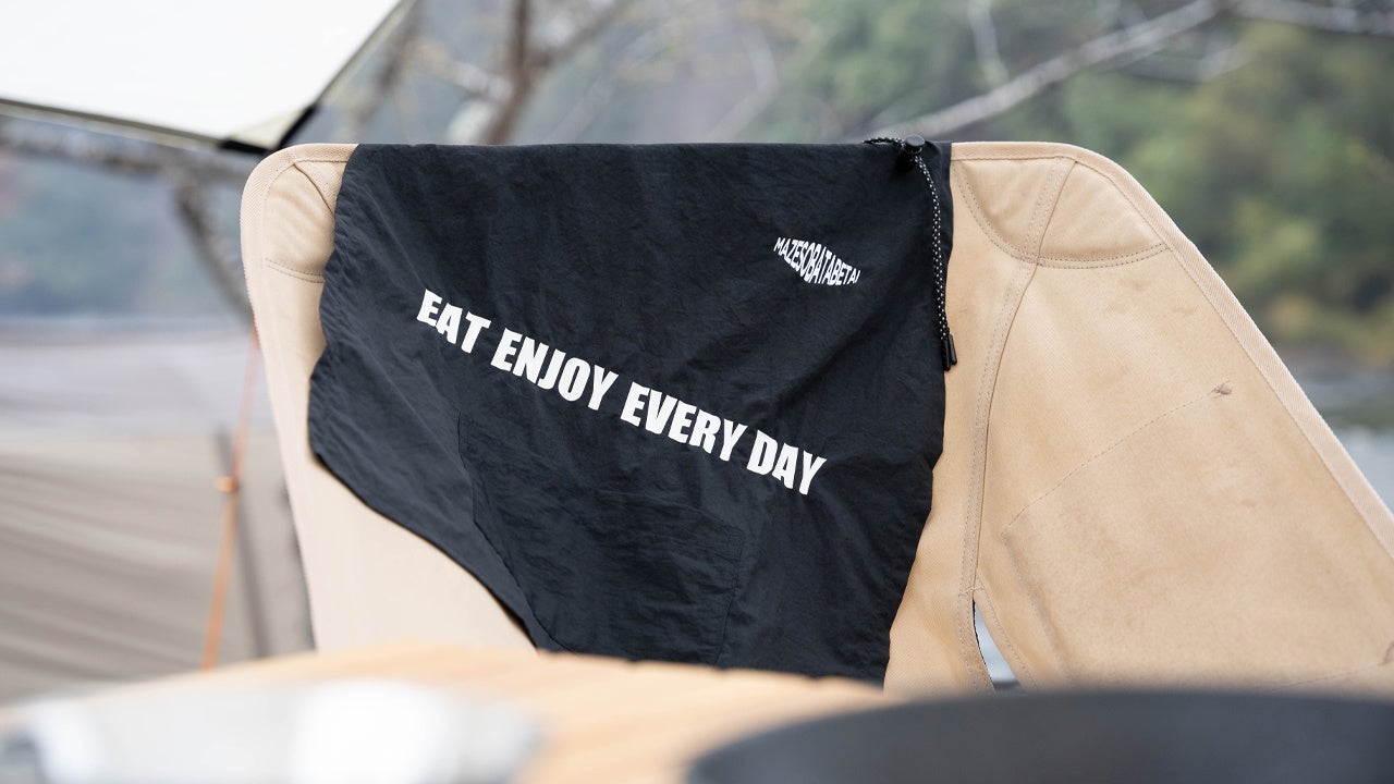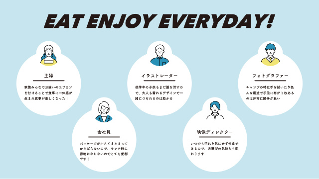 Eco、Easy、Enjoy、Enrich、Everyの5つのEをコンセプトにどんなシーンにもコンパクトで持ち運びに便利な畳めるエプロンを作りました! 食事の天敵である服の汚れから衣類を守るべく誕生したエプロンです。