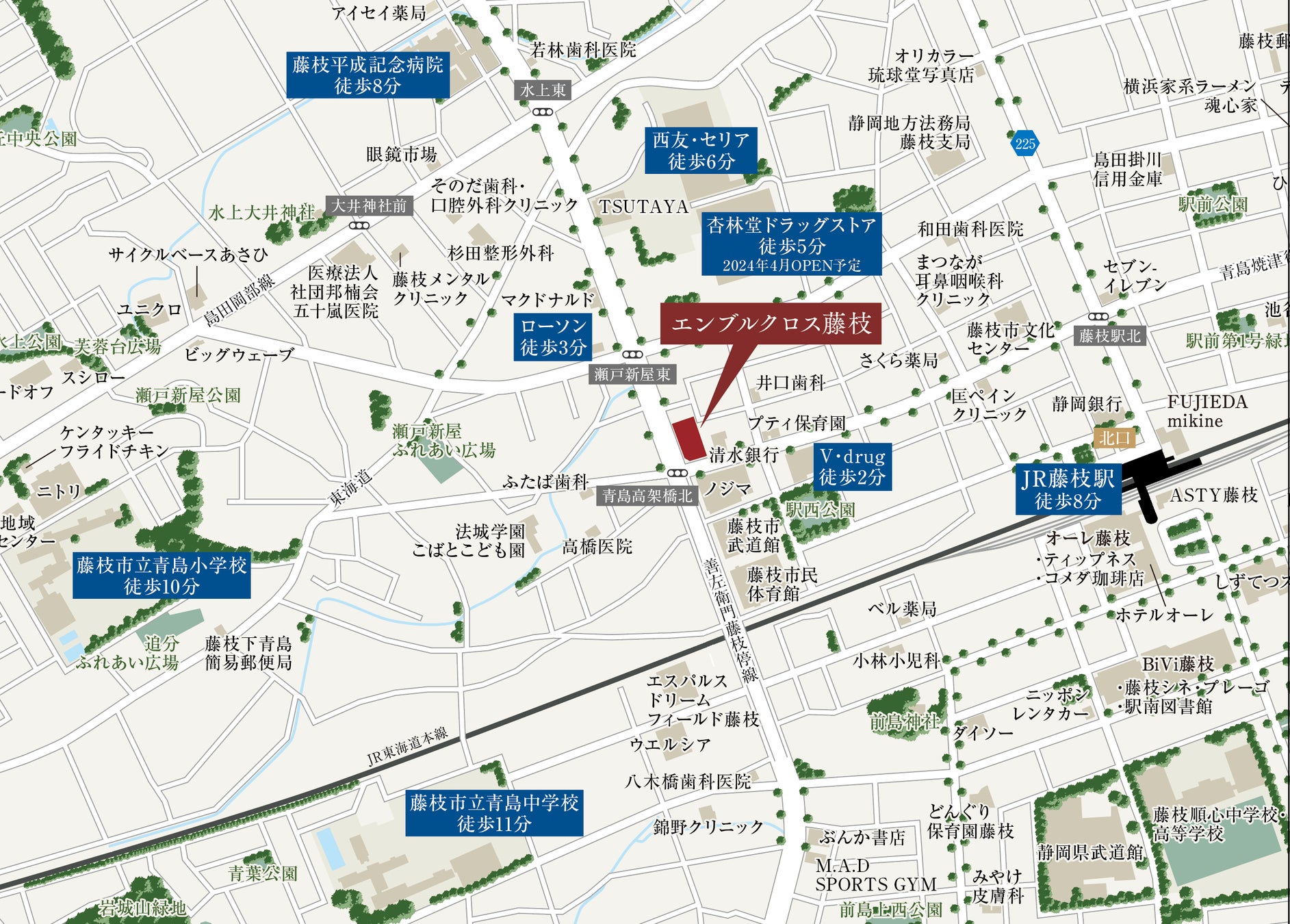 JR「藤枝」駅まで徒歩8分の立地に誕生します。徒歩圏内に24時間営業のスーパーやドラッグストア、病院、小中学校などがそろい、生活利便性が高いエリアです。