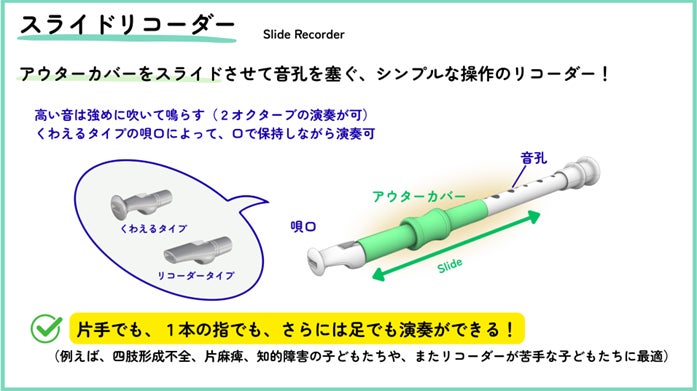 日本の小学校で3年生から習うリコーダーは、手に特徴のある子ども達にとっては演奏がしづらく、音楽を楽しむことができません。そのような子ども達も演奏を楽しめるよう、片手でも、1本の指でも、さらには足でも演奏できるスライドリコーダーを製品開発しました。