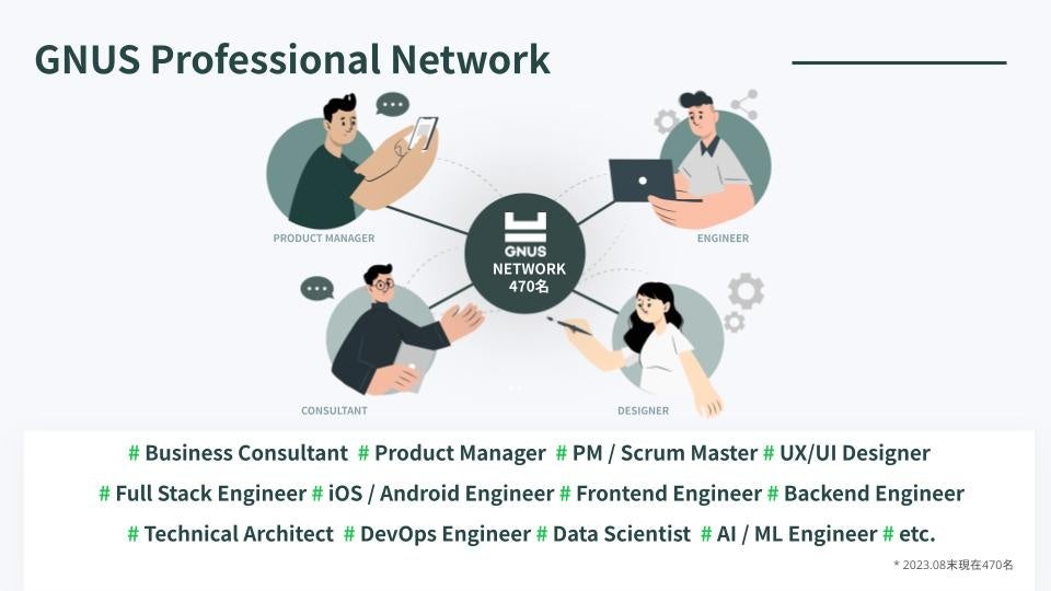 GNUS Professional Networkとは、株式会社GNUSが運営する、テックおよびデザインの精鋭が在籍する審査制フリーランスネットワークです。株式会社GNUSではを選抜チーム化し、コンサルティング・開発案件を推進していきます。オープンバッジの導入においてネットワークメンバーの知識・スキル・経験を可視化・公開することで、さらなるキャリア開発を支援します。
