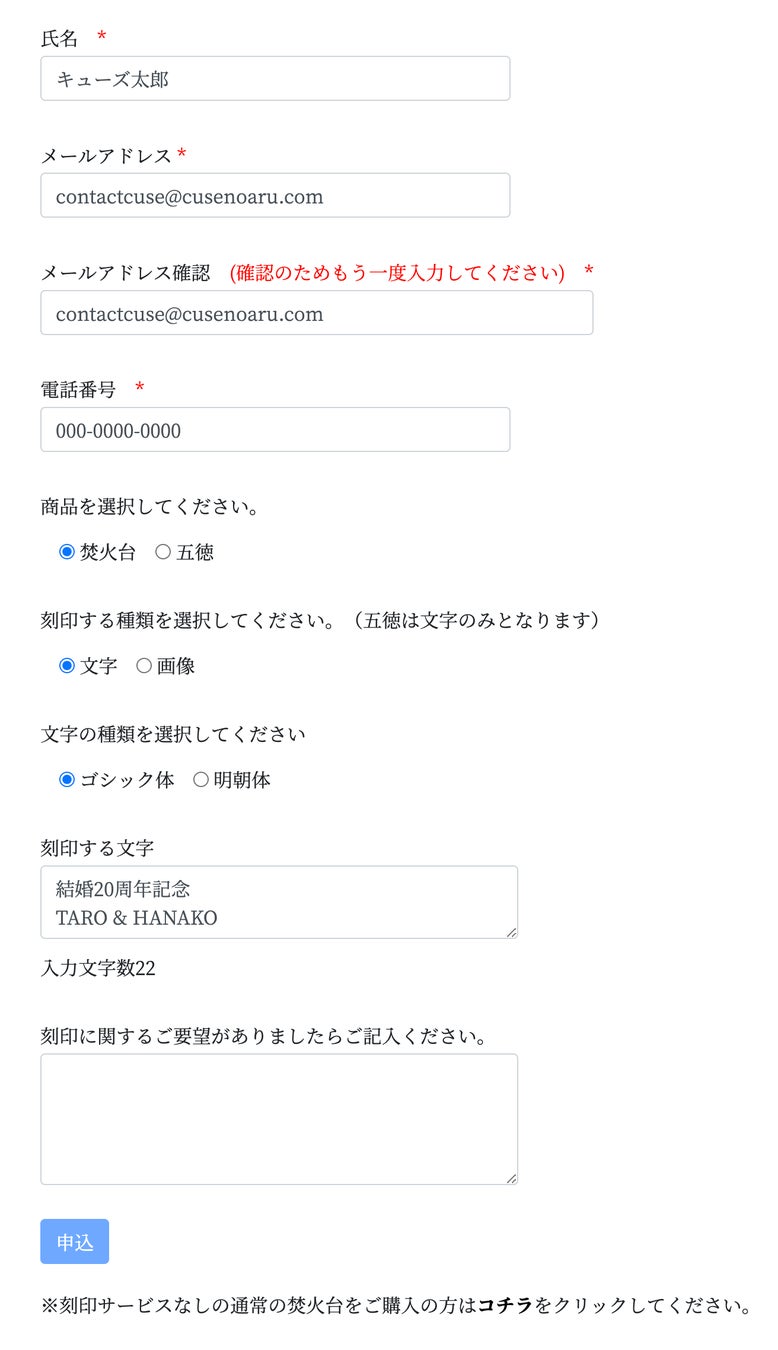 サービス内容、価格等を確認後、注意事項に同意の上、お客様情報と刻印内容を記入いただき申し込みをいただきます。