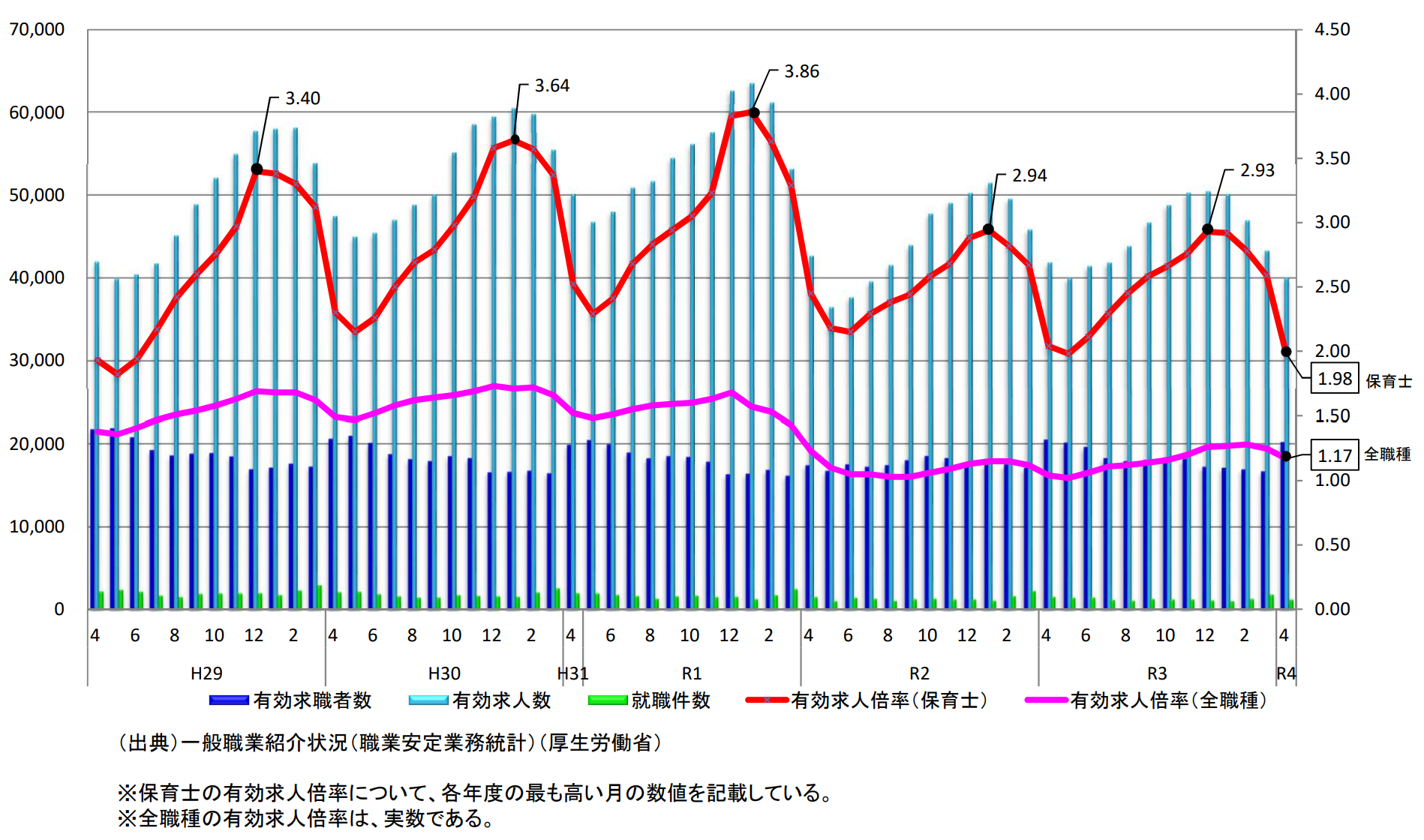 令和4年4⽉の保育⼠の有効求⼈倍率は1 .98倍であり、全職種平均の1.17倍を上回っており保育⼠の採⽤難が顕著です。