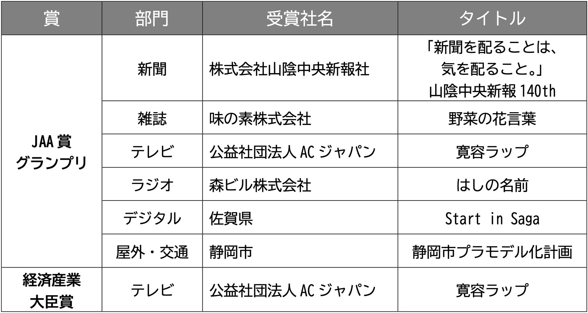 ※「JAAグランプリ テレビ広告部門」と「経済産業大臣賞」を受賞した「公益社団法人ACジャパン/寛容ラップ」は同一作品での受賞となります。