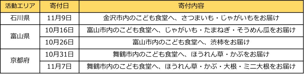 全国での活動開始後、10月から11月上旬にかけて、3エリアにてオーナー様からたくさんの農作物をご提供いただき、地域の子どもの食事提供やコミュニティづくりの活動をする団体へお届けしました。