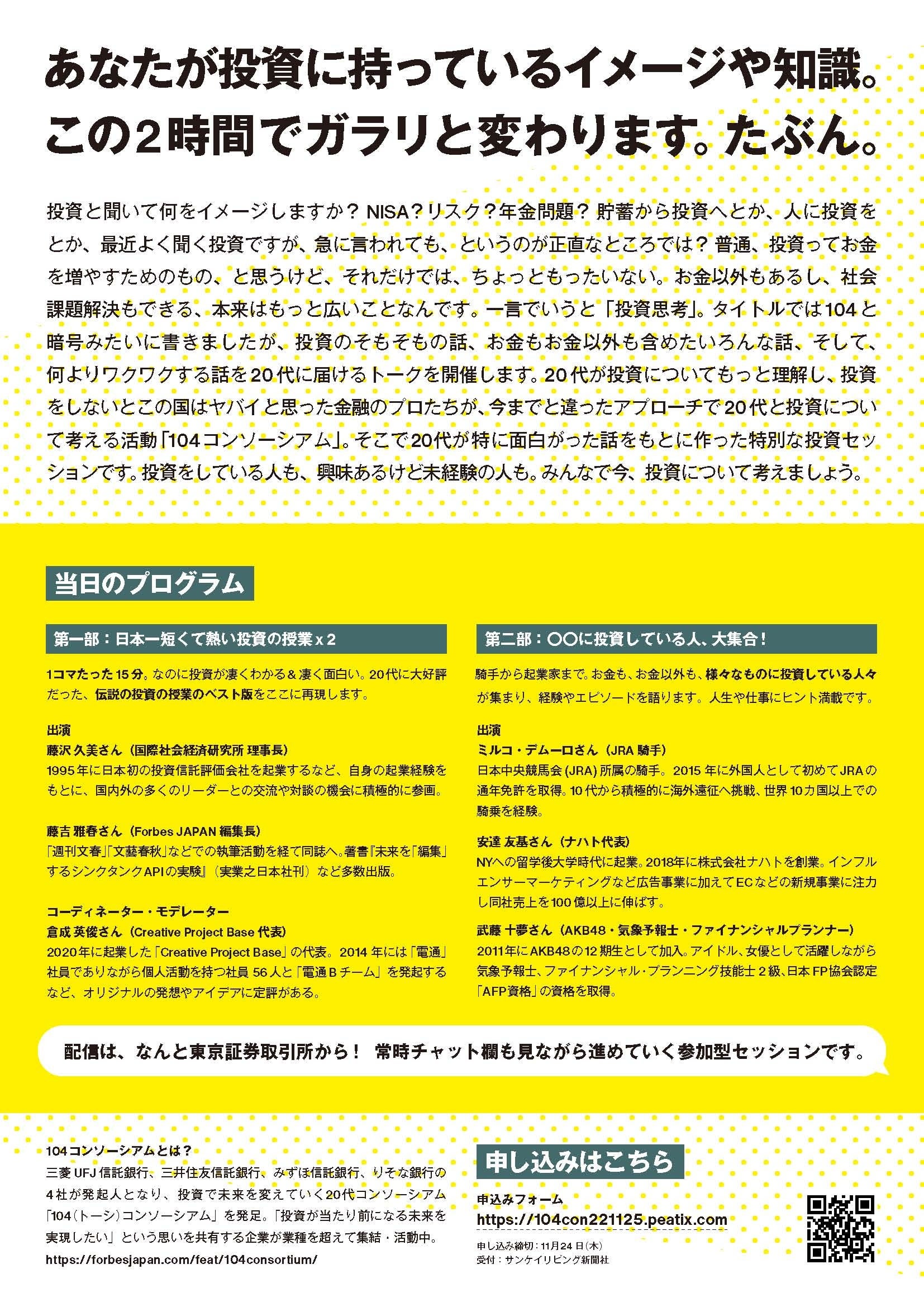一言でいうと「投資思考」。タイトルでは104と暗号みたいに書きましたが、投資のそもそもの話、お金もお金以外も含めたいろんな投資の話、そして、何よりワクワクする話を20代に届けるトークを開催します。