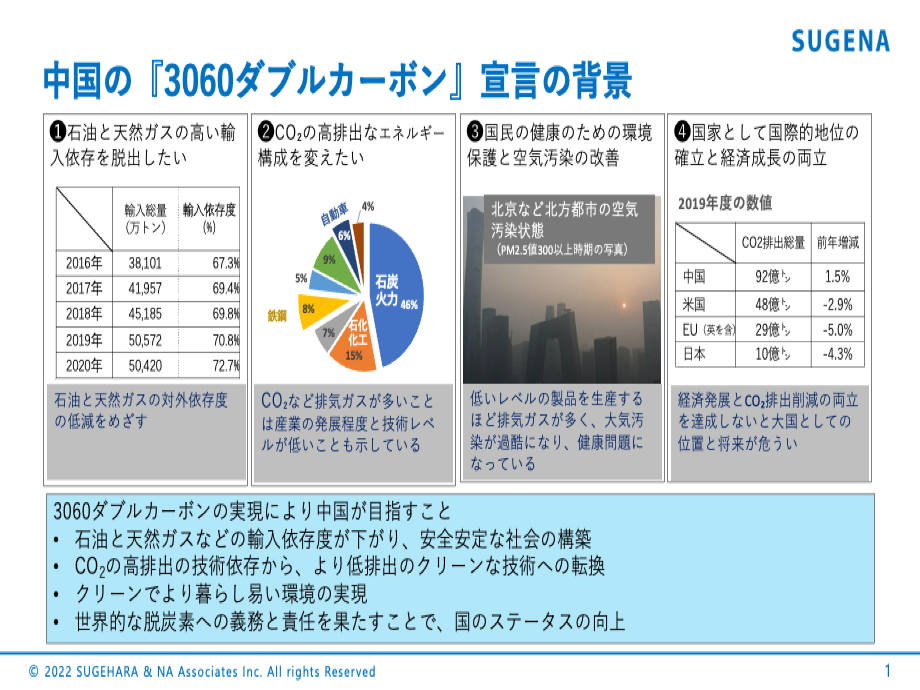 日本企業の海外事業支援、特に中国における新規事業開拓・既存事業の立て直し支援などを行う 株式会社SUGEHARA&NA Associatesが、今一番ホットな中国における脱炭素政策「3060ダブルカーボン」に関する調査レポートを発行。